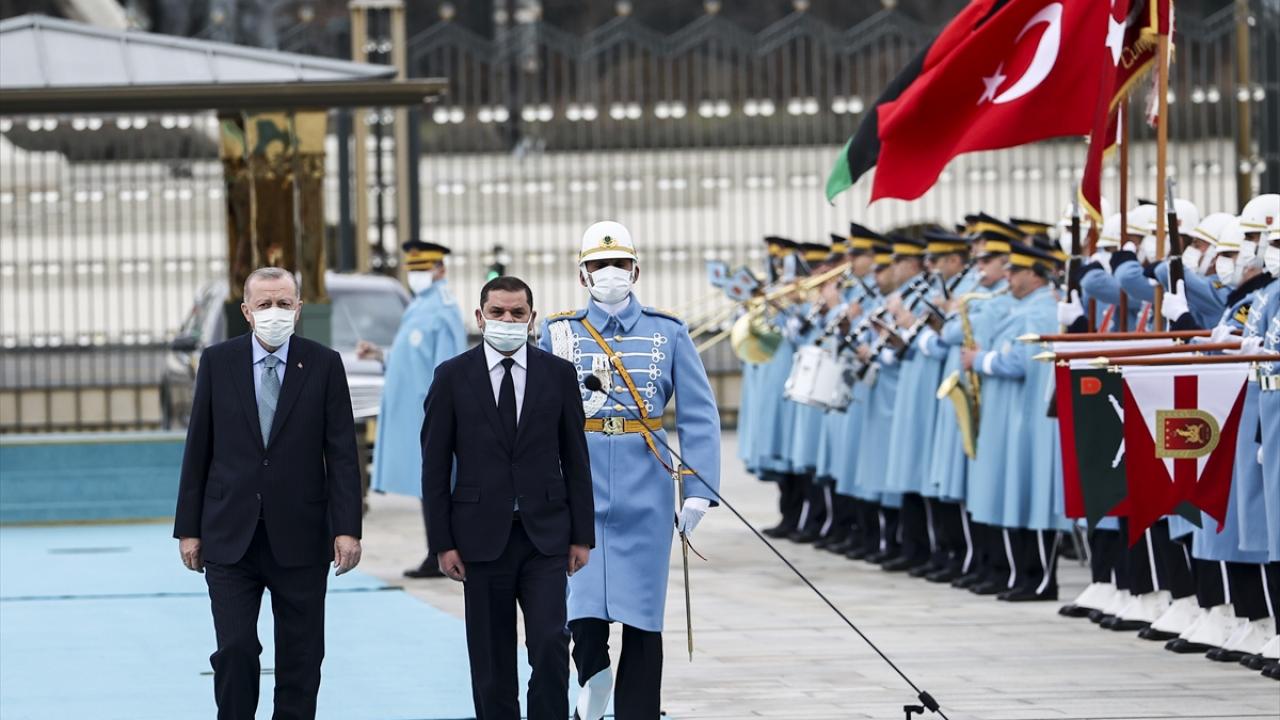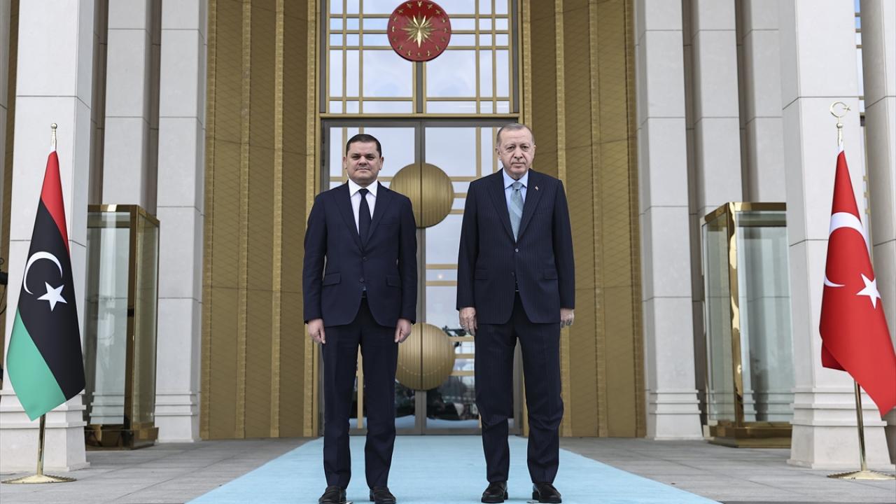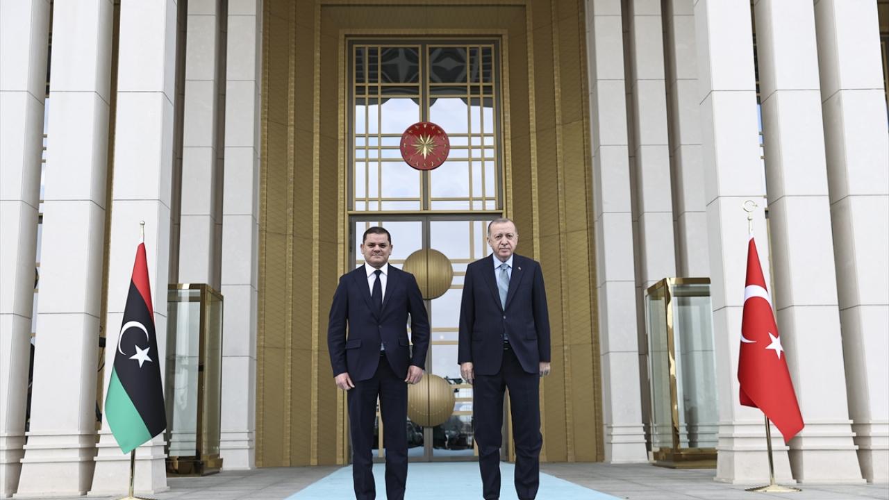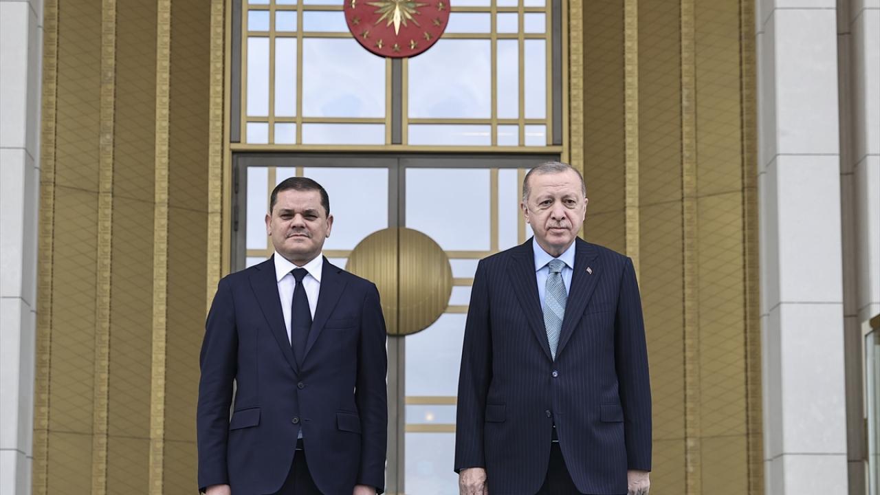 Daha sonra birbirlerine heyetlerini takdim eden Erdoğan ve Dibeybe, merdivenlerde Türkiye ve Libya bayrakları önünde gazetecilere poz verdi.