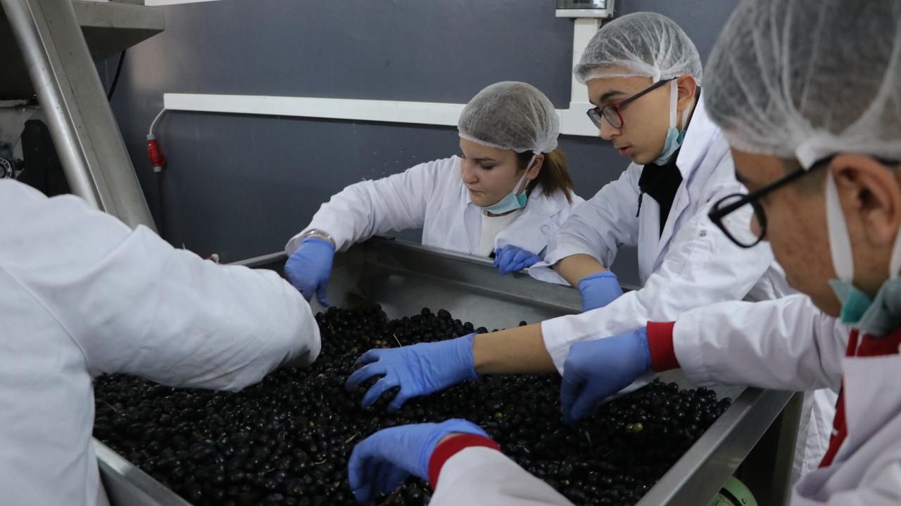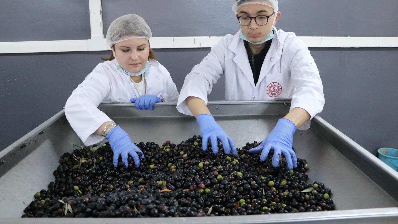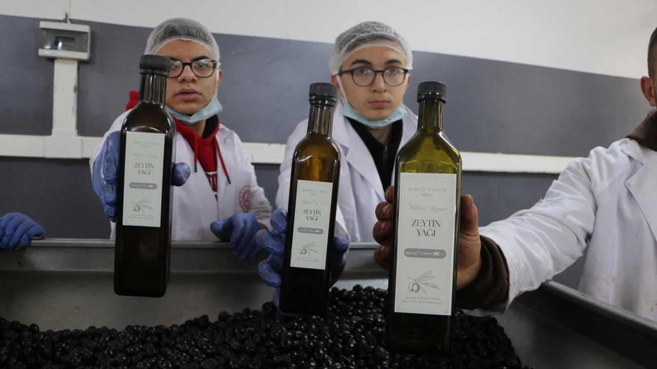 Tekirdağ'ın Şarköy ilçesinde 17 Kasım Mesleki ve Teknik Anadolu Lisesi Gıda Teknoloji Bölümü öğrencileri okul bahçesinde bakımını ve hasadını yaptıkları zeytinleri toplayıp hem zeytinyağı üretiyor hem de profesyonel deneyim kazanıyor.
