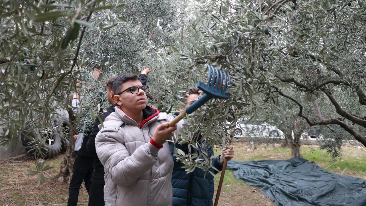 Öğrenciler de okul bahçesindeki 90 zeytin ağacının bakımını yapıyor, hasat ediyor.