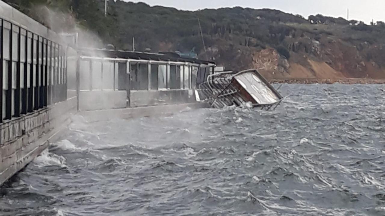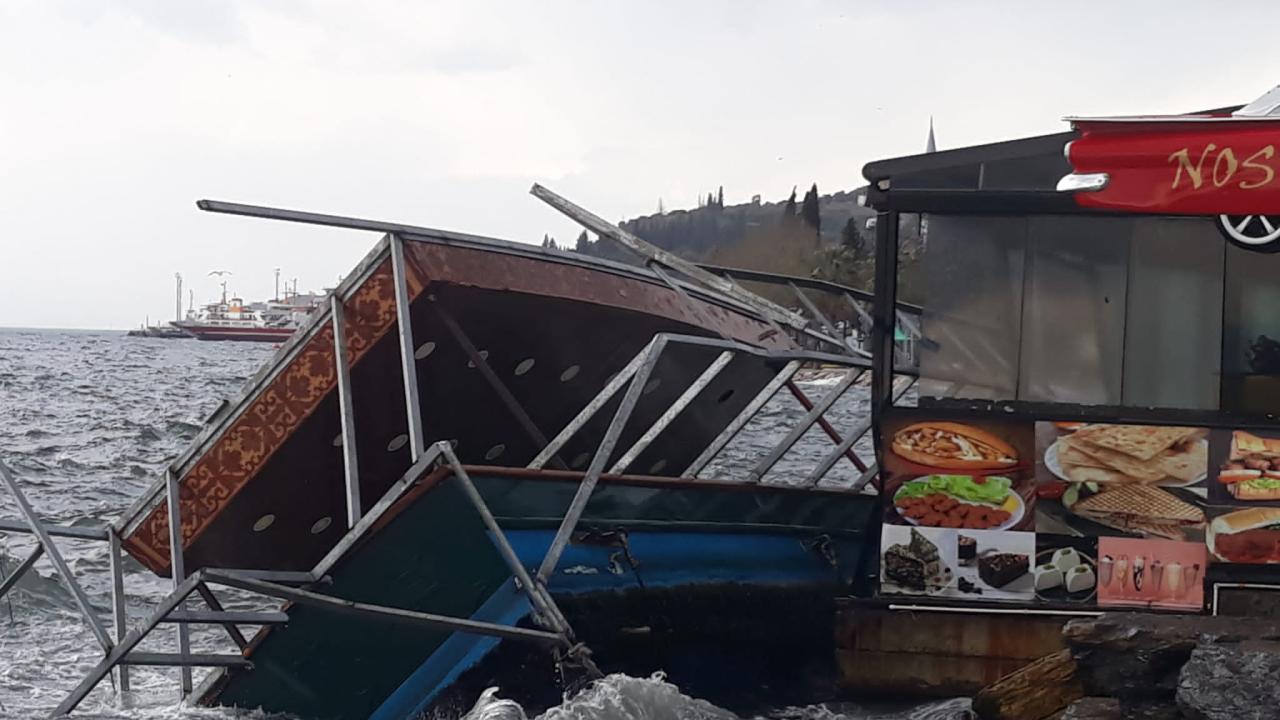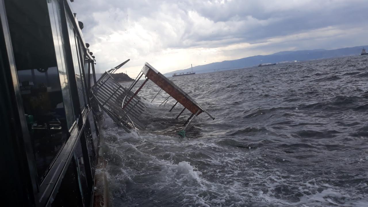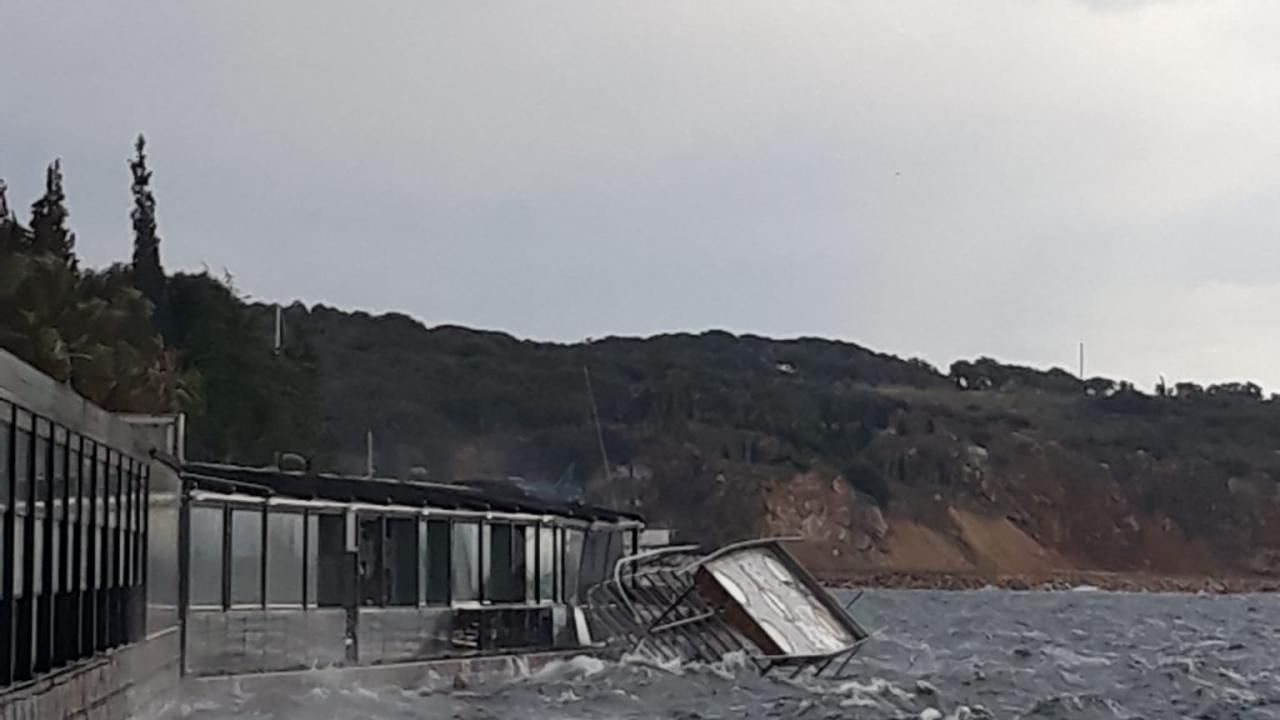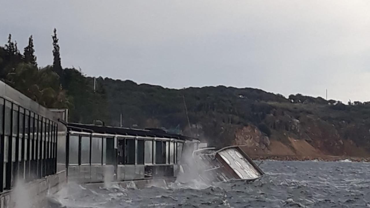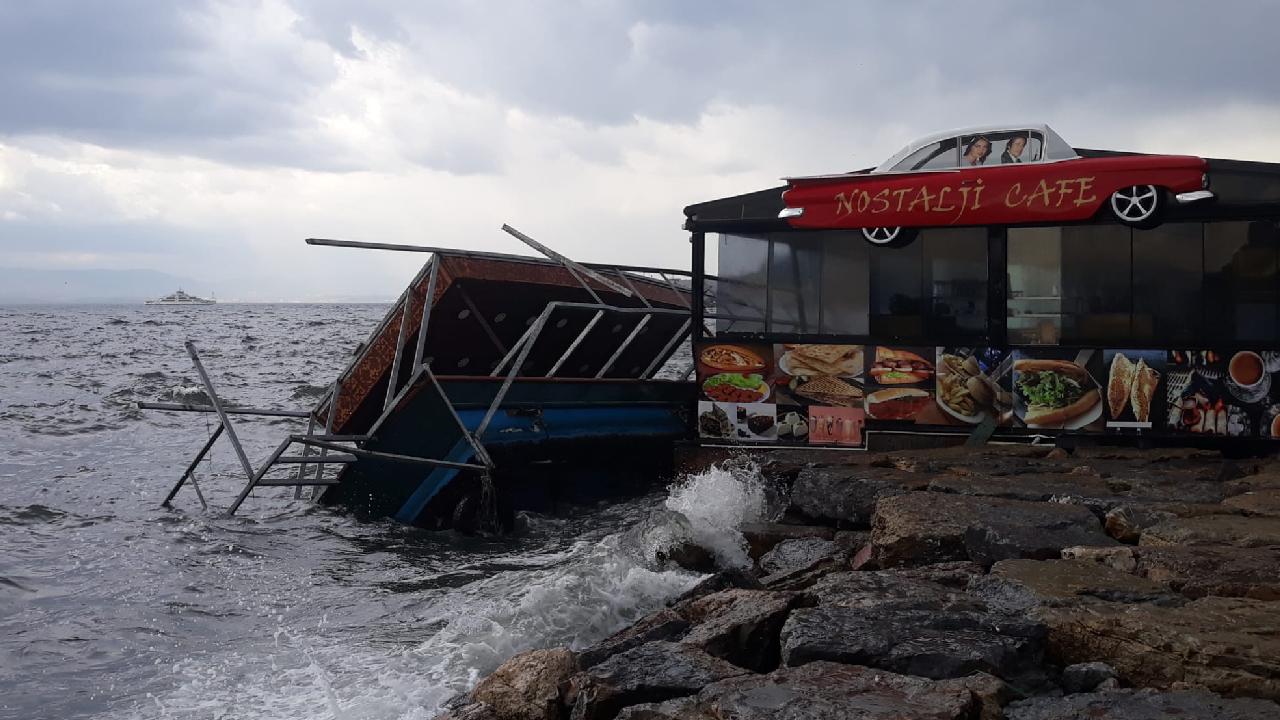 Kocaeli’nin Gebze ilçesinde lodos etkili olurken, sahildeki kafenin önünde, balık ekmek satışı yapılan tekne devrildi. Tekne, dalgaların etkisiyle kafeye çarpınca camlar hasar gördü.