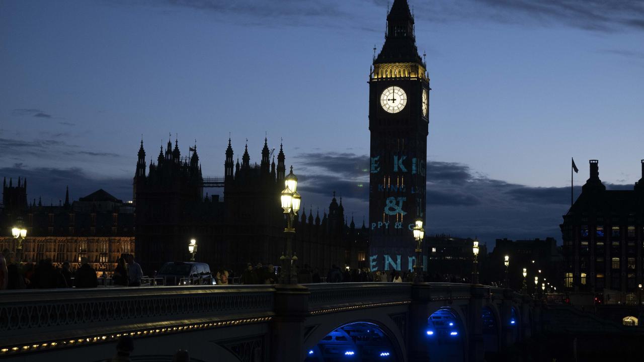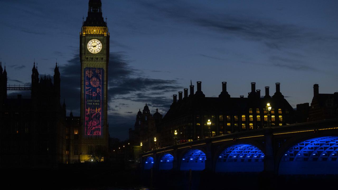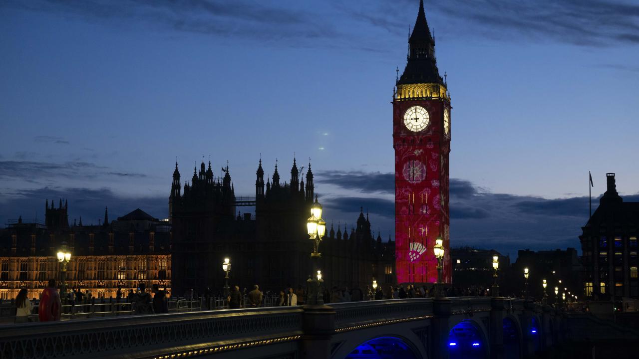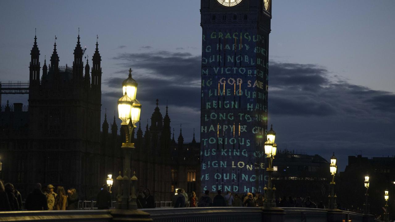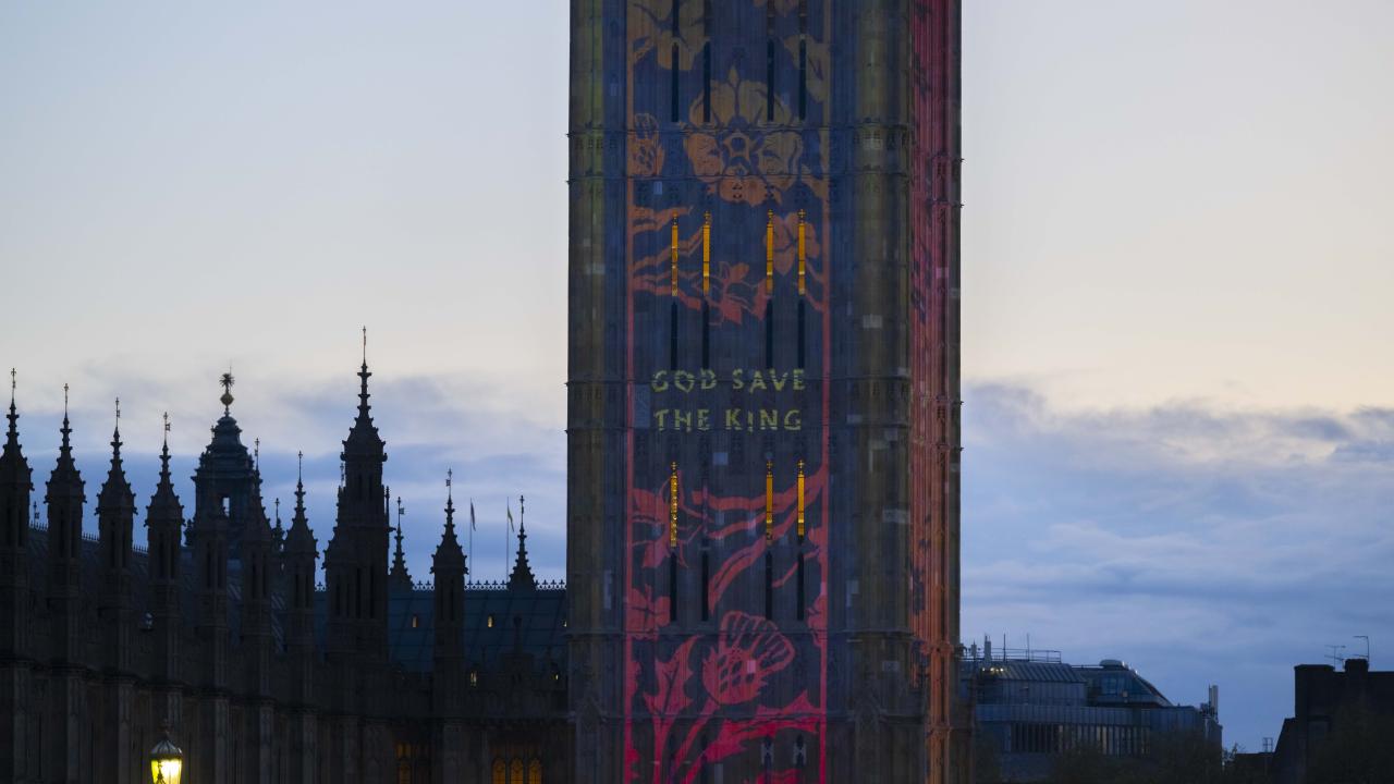 Kral 3.Charles'in yarın gerçekleşecek olan taç giyme töreni kutlamaları kapsamında Londra'daki Big Ben Saat Kulesi "Taç giyme töreni" temalı ışık gösterisi ile aydınlatıldı.