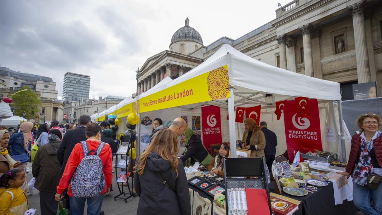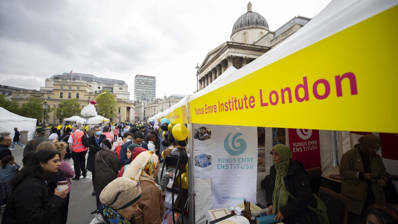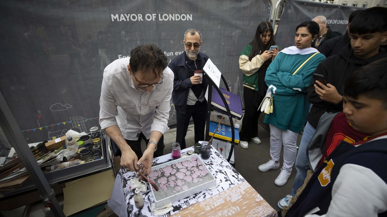 Londra Yunus Emre Enstitüsü (YEE) çalışanları da açtıkları stantta, enstitünün çalışmalarına ilişkin ziyaretçileri bilgilendirdi, ebru sanatını tanıttı.