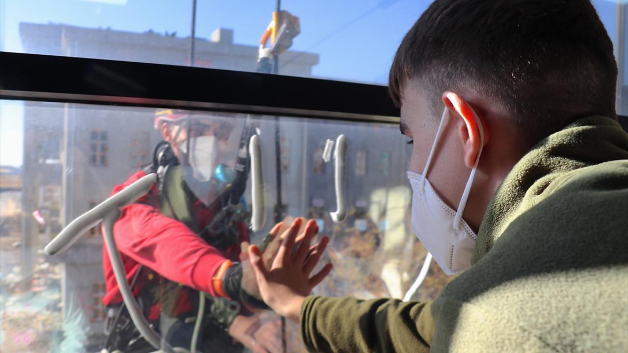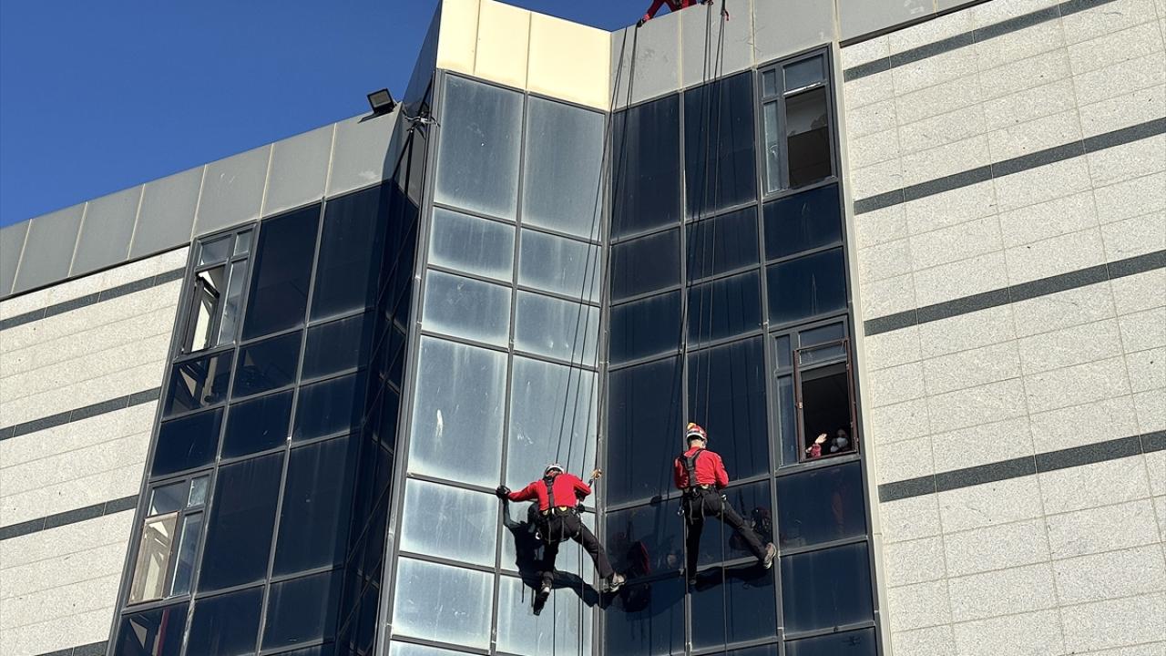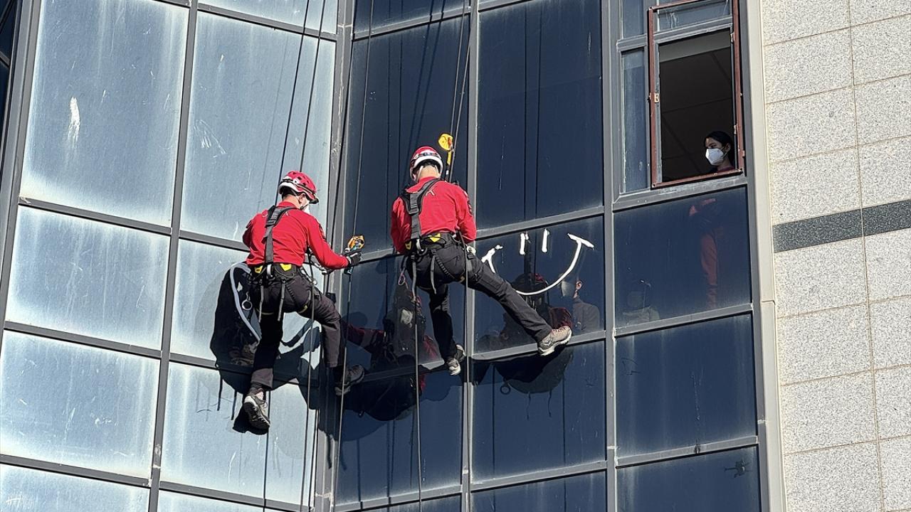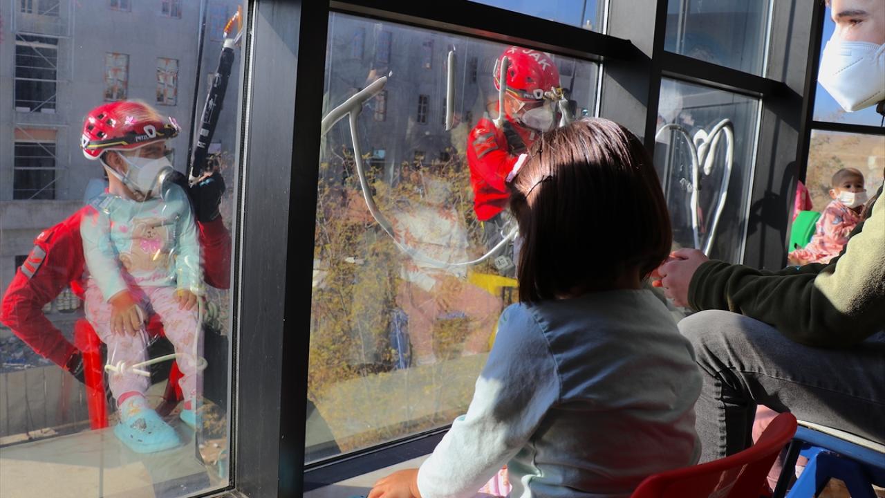 JAK Timi hastane binasının çatısından sarkıttıkları iplerle pencerelere inerek çocuklara el salladı, camlara köpüklerle gülen yüz ve kalpler çizdi.