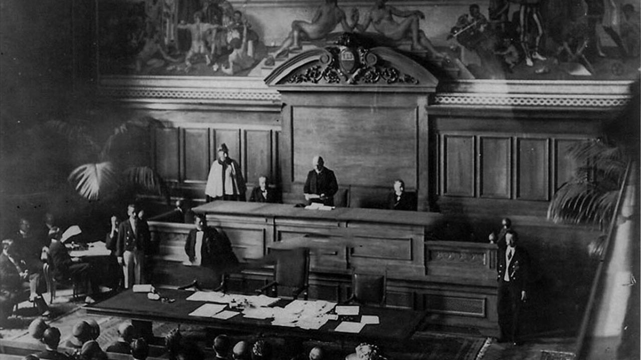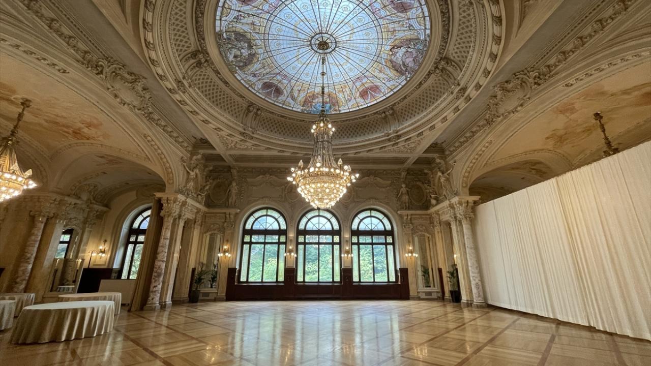Barış Konferansı görüşmelerinin yapıldığı Sandoz Salonu, bu tarihi mekanı görmek isteyenleri iki kanatlı kapısıyla karşılıyor.