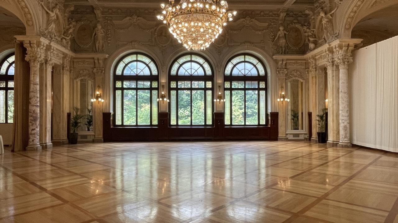 Salonun duvarlarında freskler, tavanında cam vitraylar, orta bölümünde ise büyük bir avize yer alıyor. Baş köşedeki bölümde devasa ayna ile orta bölümünde büyük pencereler bulunuyor. Tarihi yapısı muhafaza edilen salonda, zaman zaman bazı toplantı ve etkinlikler gerçekleştiriliyor.