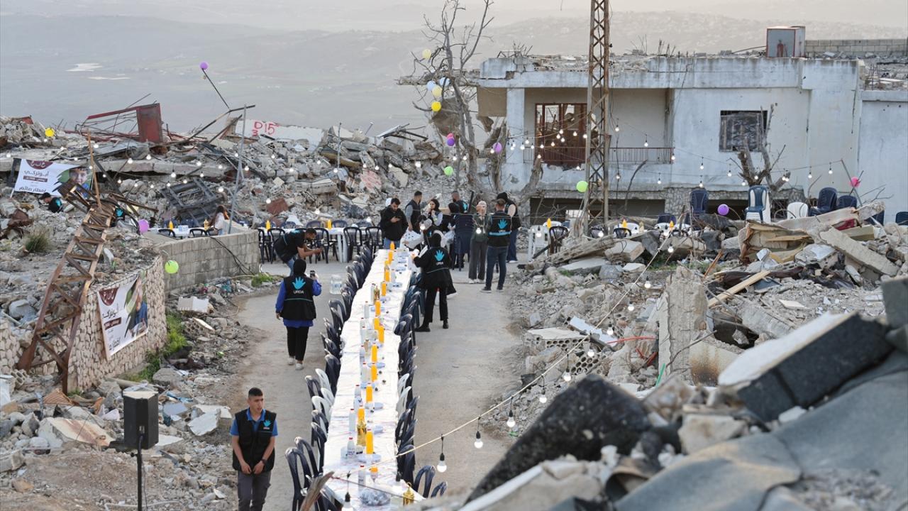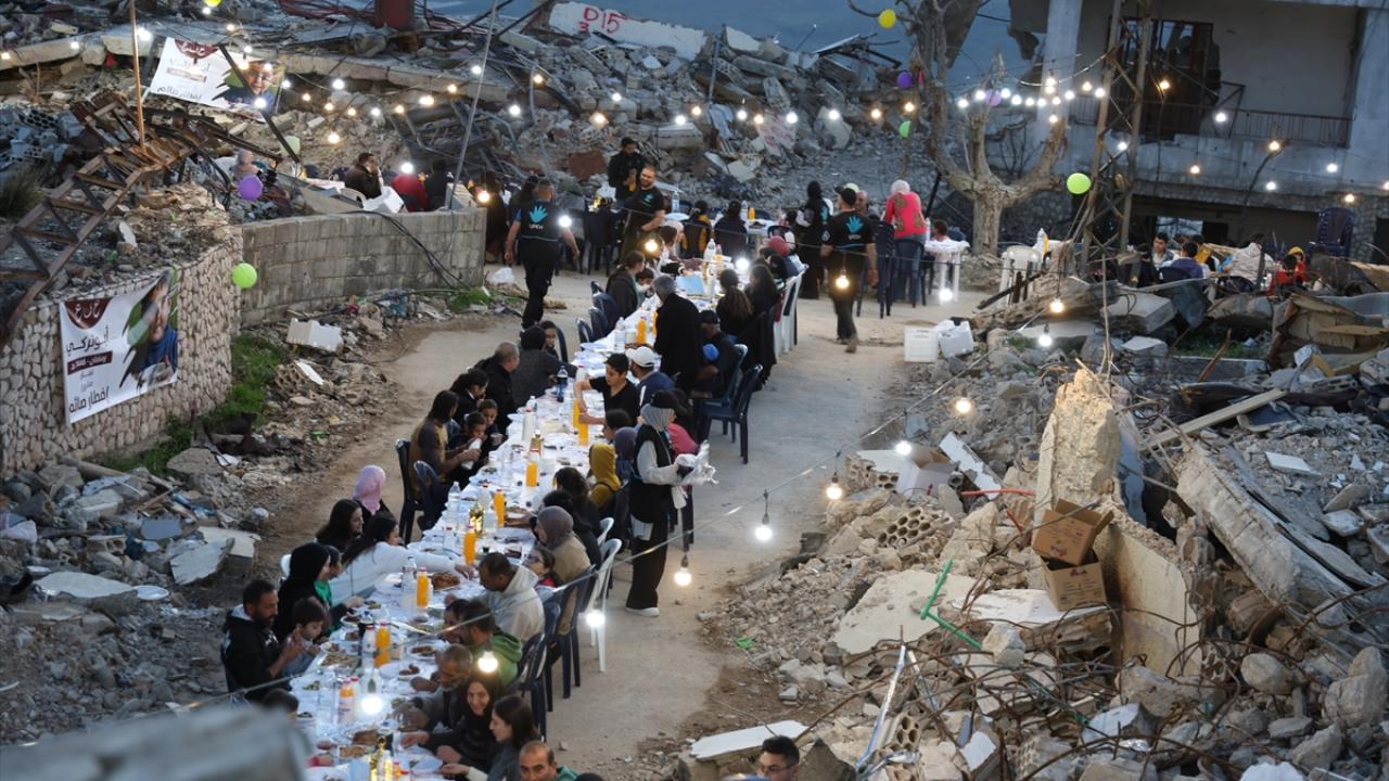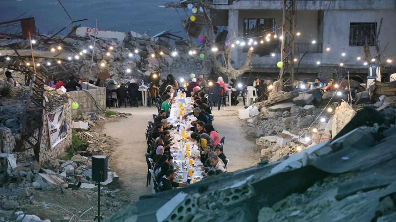 Kefr Şuba beldesinde enkaz arasında organize edilen toplu iftar programında, yaklaşık 400 Lübnanlı hep birlikte oruçlarını açtı.