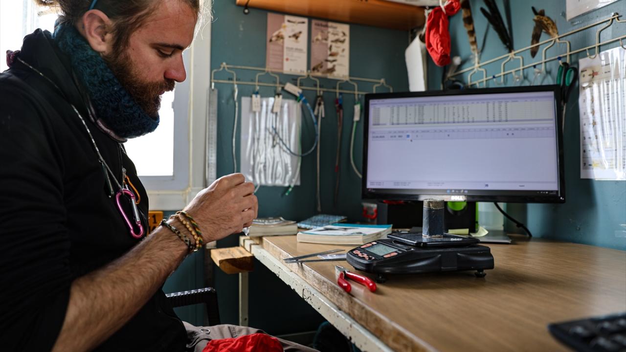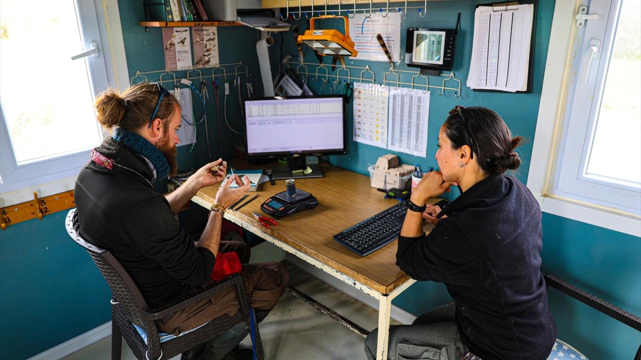 Klein, ağlara takılan kuşları halkalarken Buhagiar da halkalama çalışmalarına ve günlük işlere yardım ediyor.