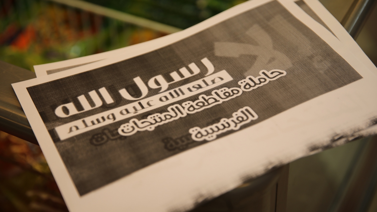 Fransız mallarının boşaltıldığı raflara, “Fransız ürünlerini boykot ediyoruz”, “Allah`ın Resulü, salat ve selam ona olsun” mesajları asıldı.