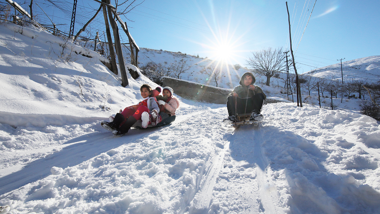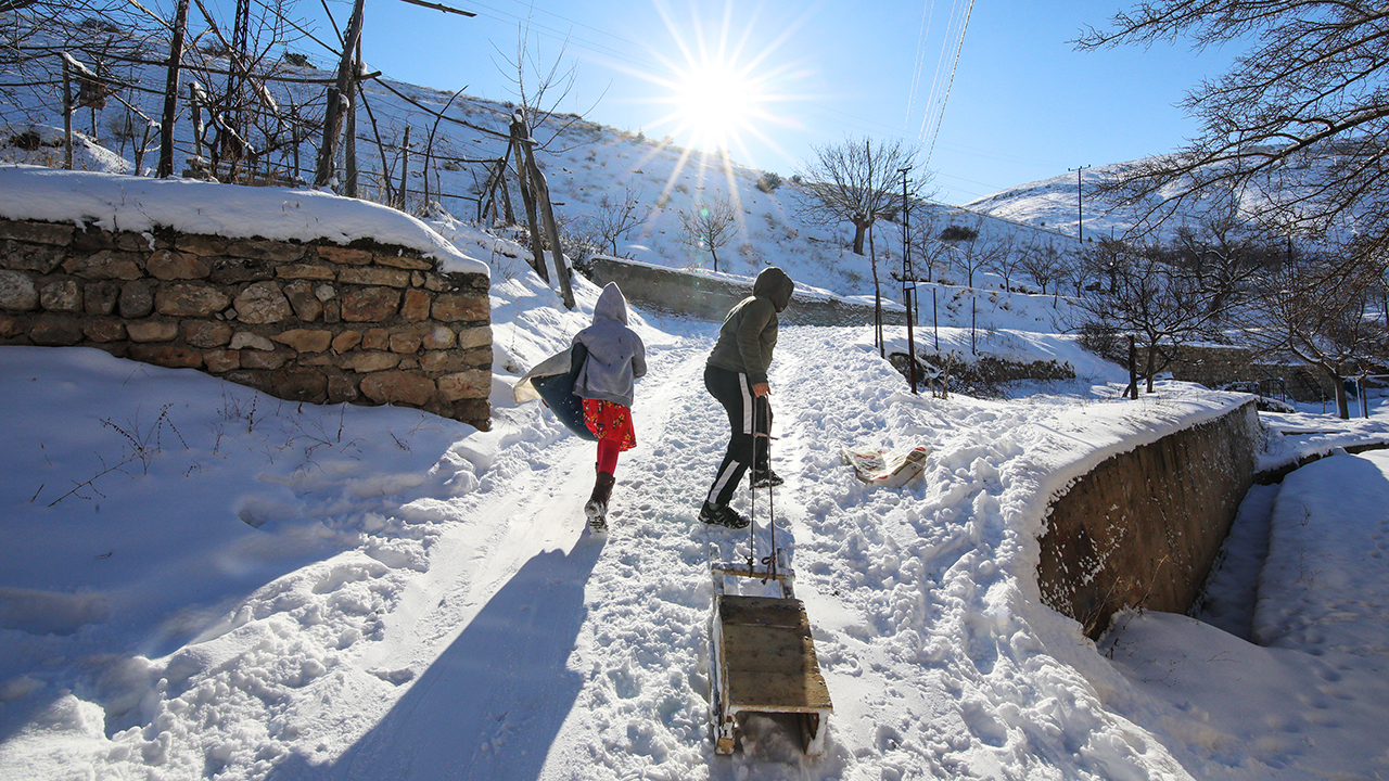 Malatya'nın Darende ilçesinde çocuklar karın keyfini poşet, naylon, plastik bidon ve kızaklarla kayarak çıkardı.