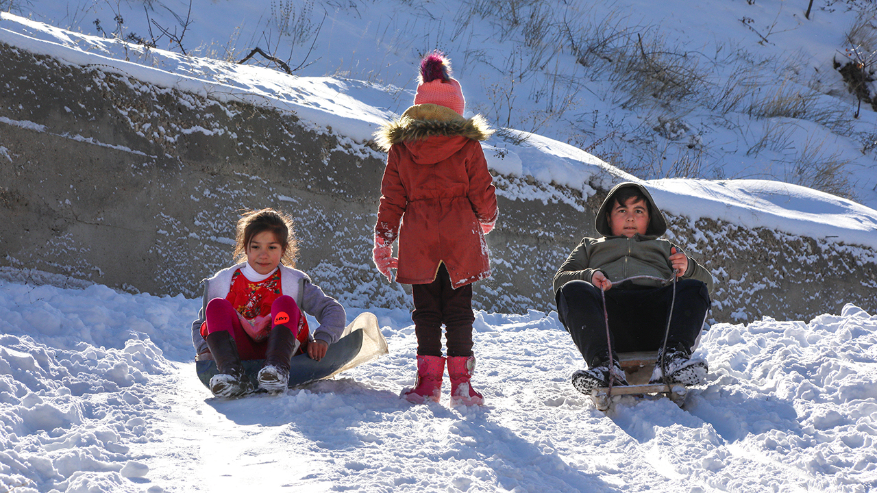 Çocukların bidon ve kızak üzerinde kaymaya çalışması renkli görüntü oluşturdu.