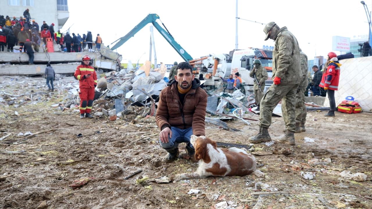 Kahramanmaraş merkezli depremlerden etkilenen Malatyalı Uğur Şahin, kent merkezindeki bir binada "Alex" isimli av köpeği ile arama ve kurtarma çalışmalarına destek veriyor.