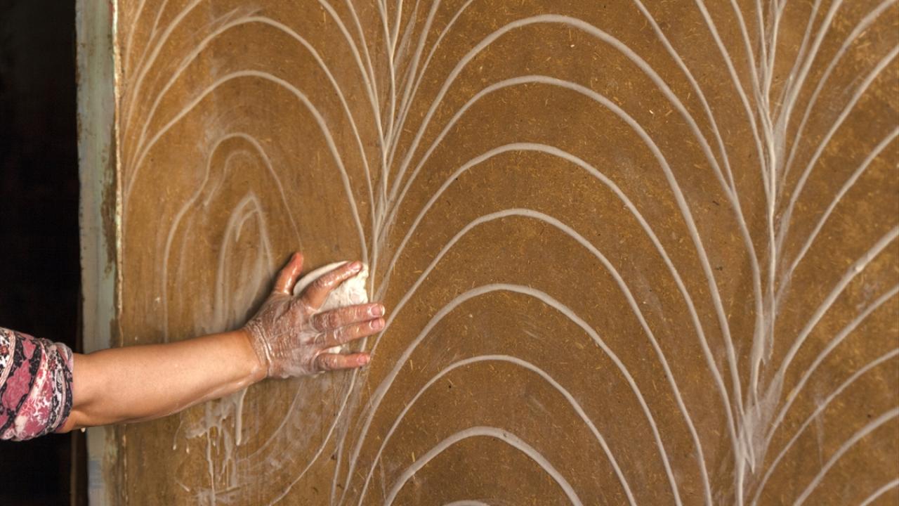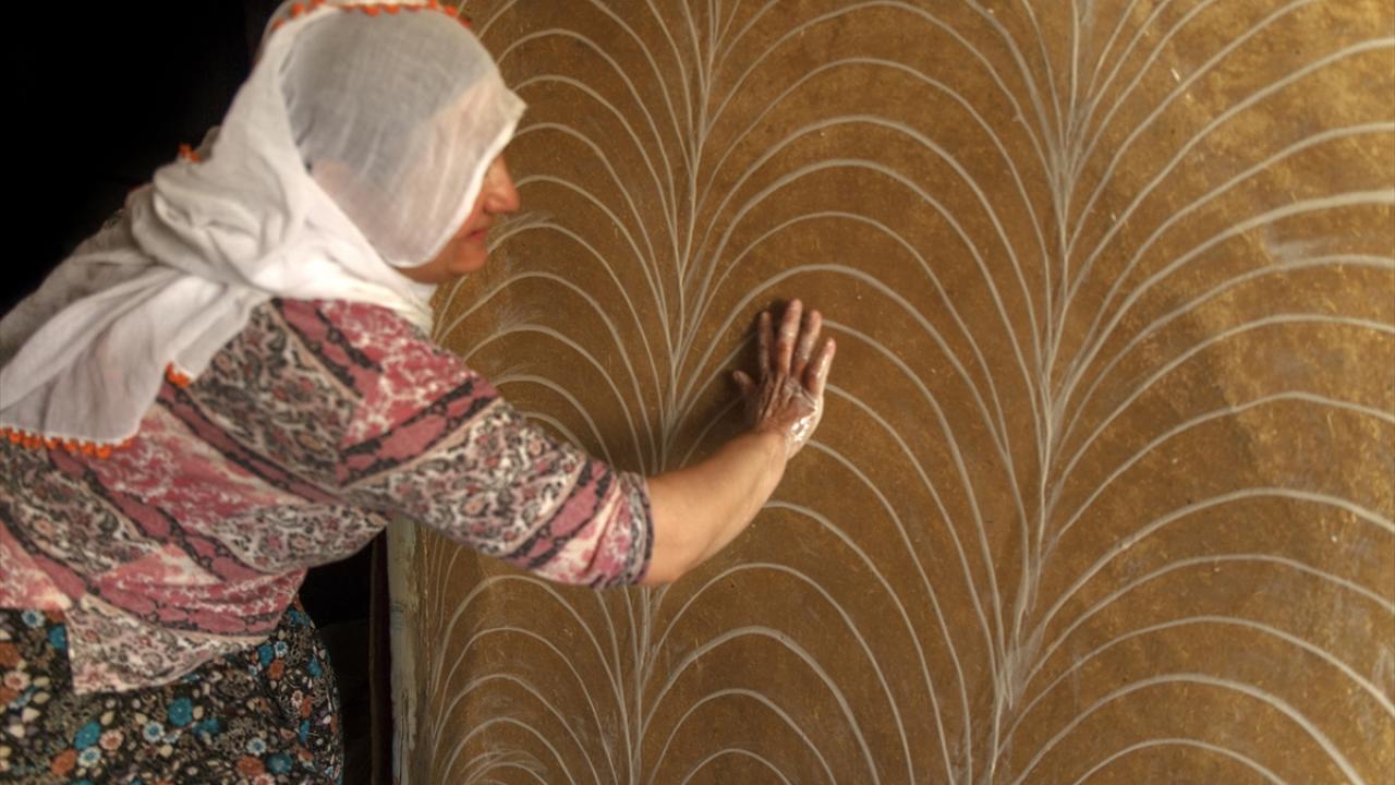 Kadınlar, kuruyan reçinenin üzerine "çarpma toprağı" dedikleri karışımla hem duvardaki pürüzleri alıyor hem de parmaklarıyla desen veriyor.