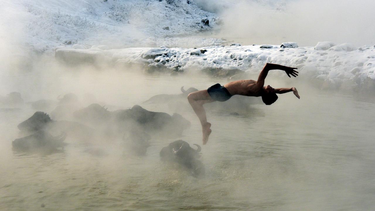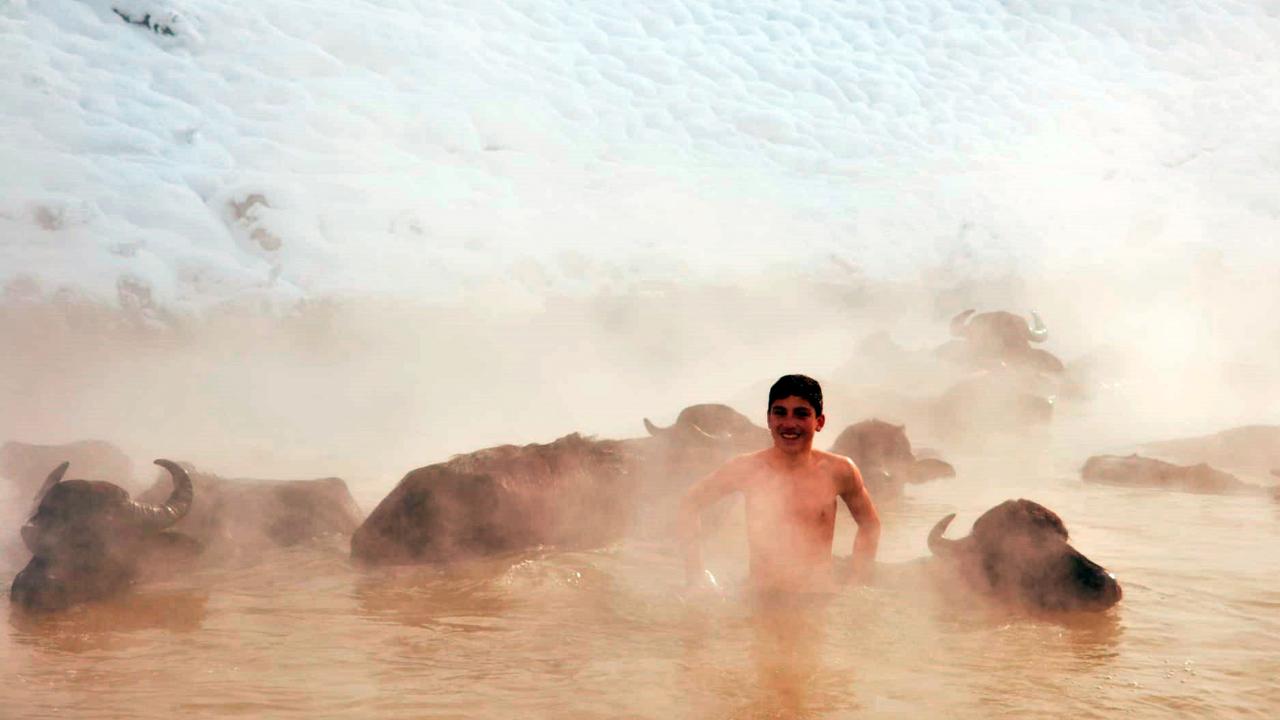 Dondurucu soğuğa aldırış etmeden hayvanları ile kaplıcaya giren gençlerin, manda ve atların üzerinden takla atarak suya dalış yapması da ilginç görüntü oluşturuyor.