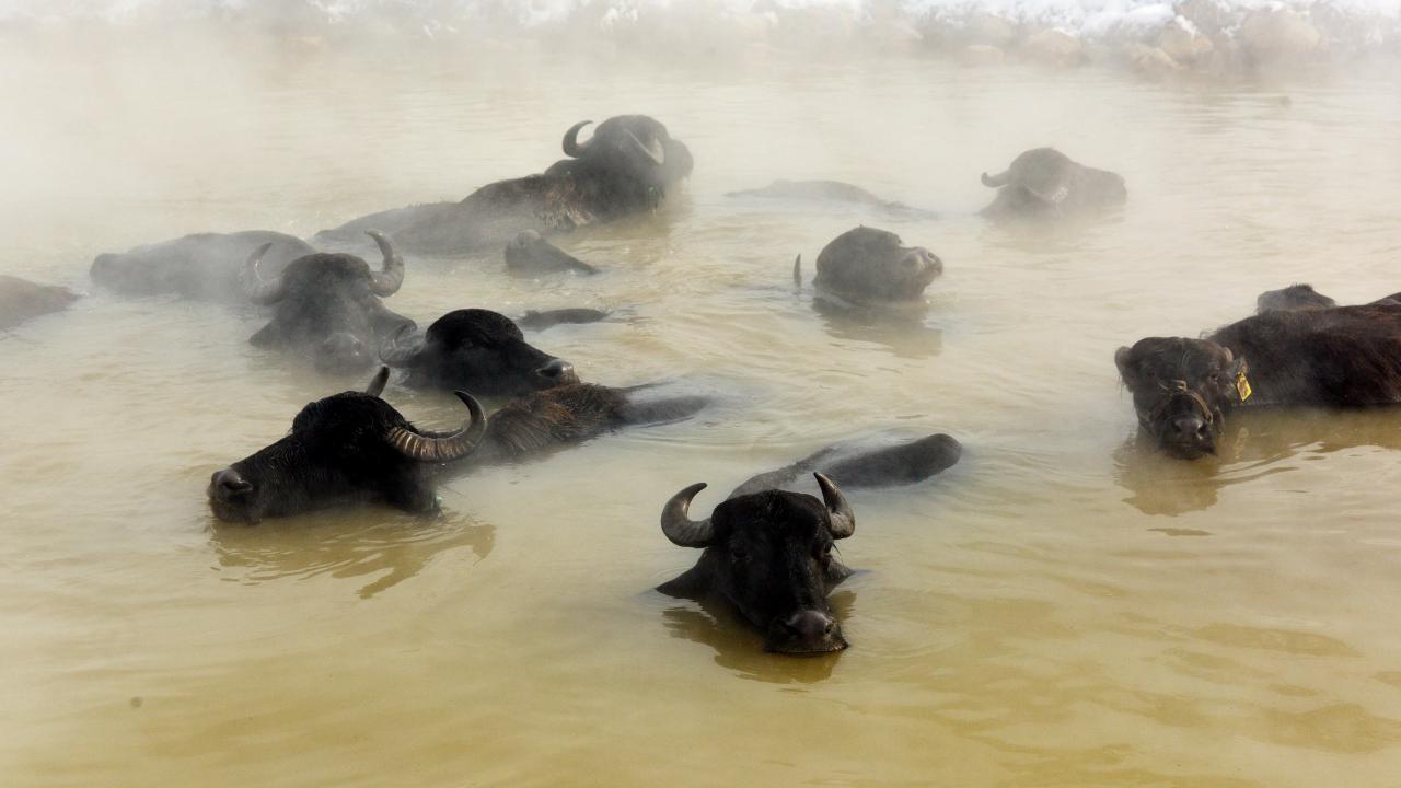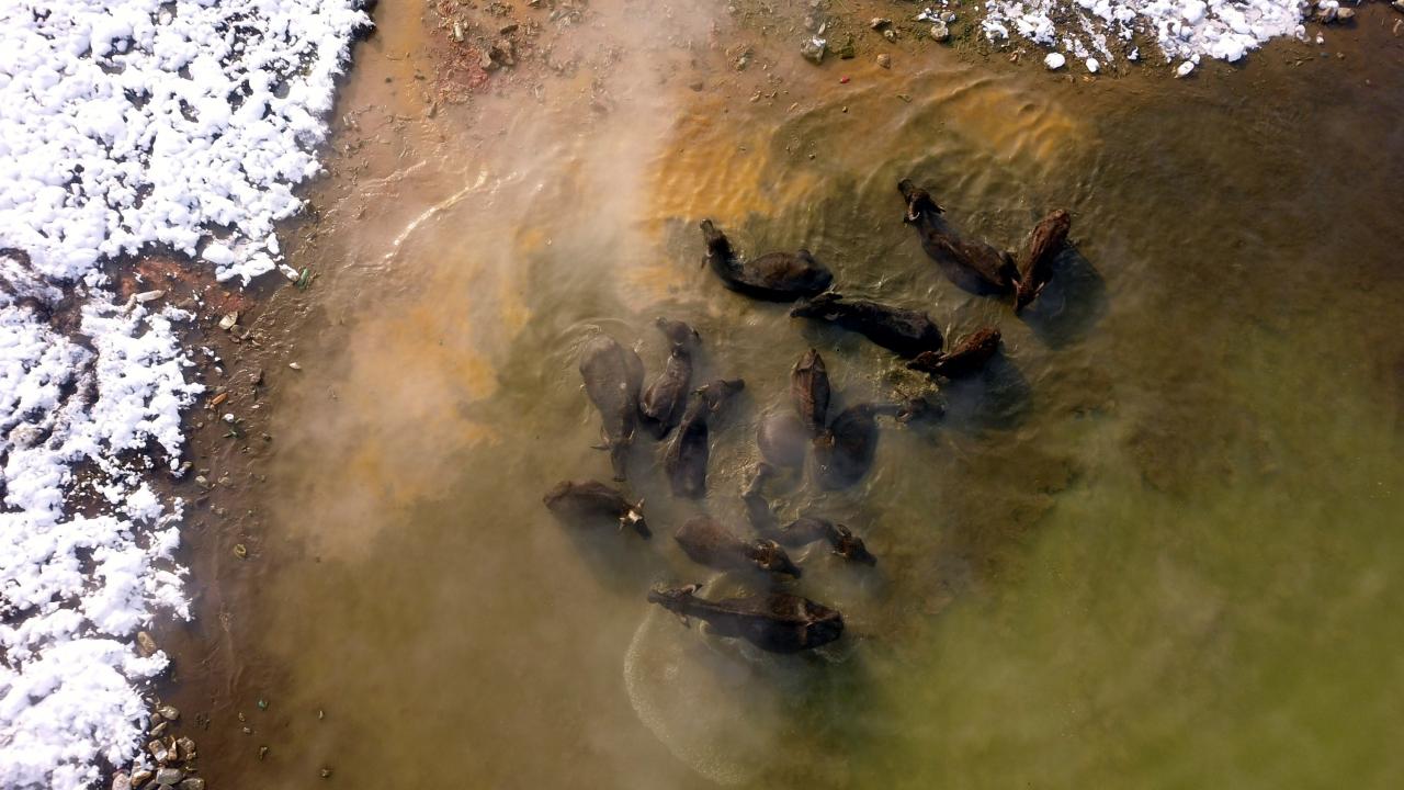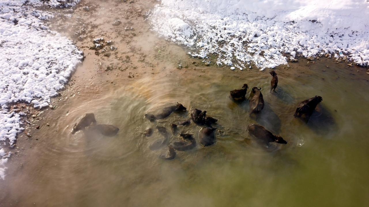 Hava sıcaklığının sıfırın altında 20 dereceye kadar düştüğü köyde, kış şartlarının ağır geçmesinden dolayı ahırlardan dışarıya çıkarılamayan manda ve atlar, rahatlatma amacıyla belirli aralıklarla kaplıcaya götürülüyor.
