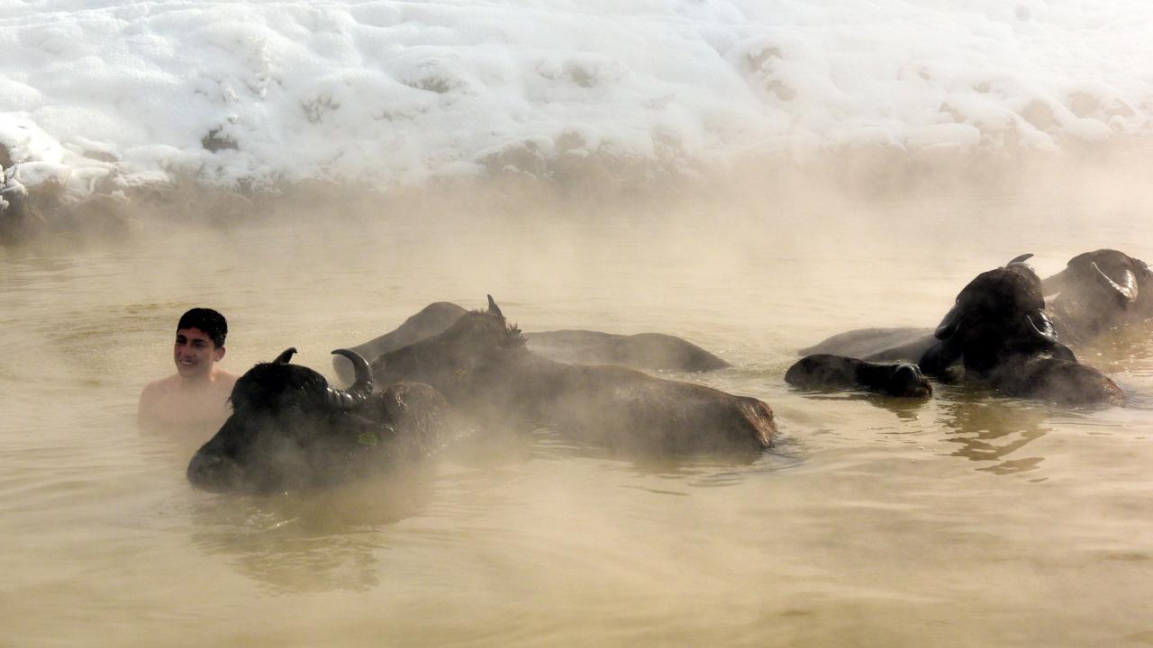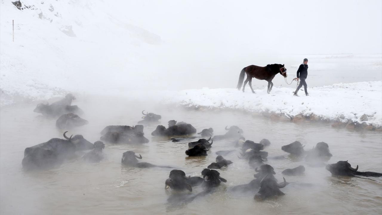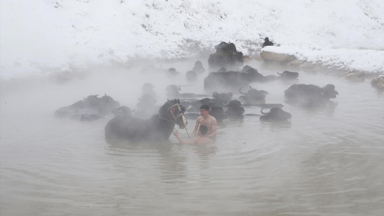 Soğuk havada hayvanları ile kaplıcanın yolunu tutan gençler, manda ve atlarını yaklaşık 3 saat boyunca etrafı karla kaplı 40 derece sıcaklıktaki kaplıca suyunda yıkıyor.
