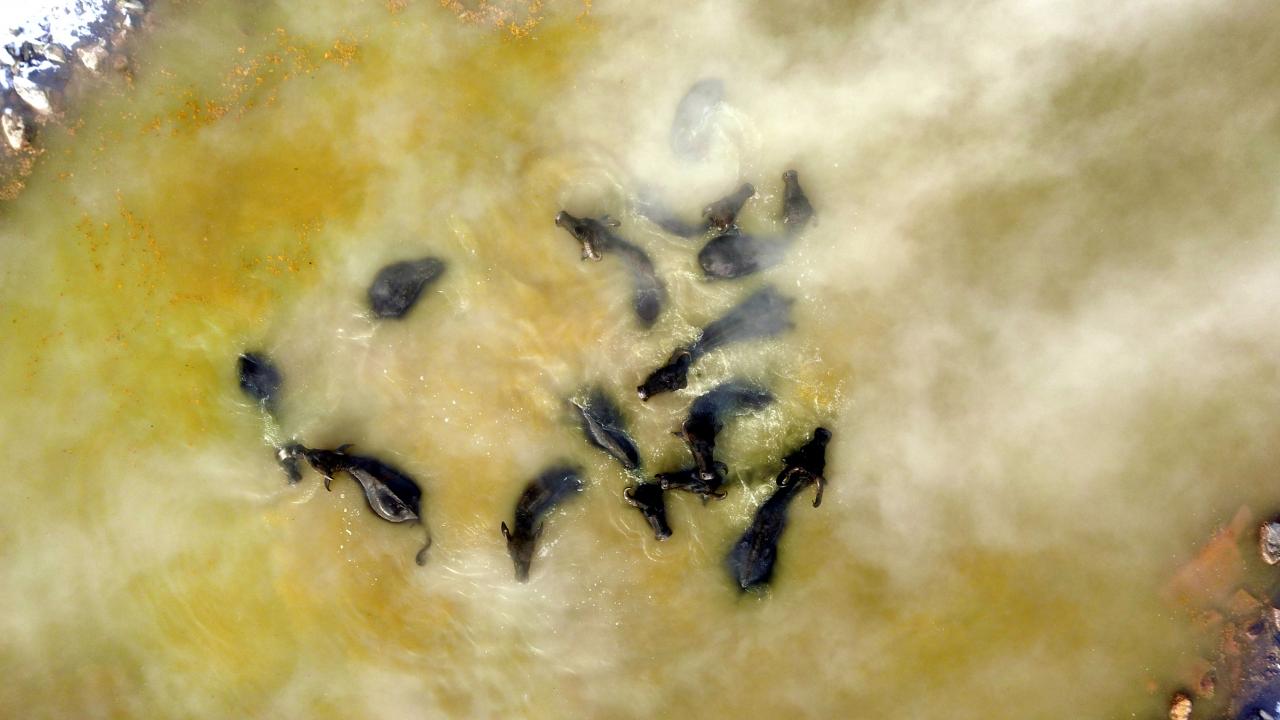 Mandalarını temizlenmeleri için kaplıca suyuna bıraktıklarını belirten Aylu, "Hayvanlarımıza kışın ahırda baktığımız için kirleniyorlar. Temizlenmeleri için kaplıcada yıkıyoruz. Biz de kaplıcaya giriyoruz, soğuk havada yıkanarak eğleniyoruz. Alanda başka kaplıcalarda var." diye konuştu.