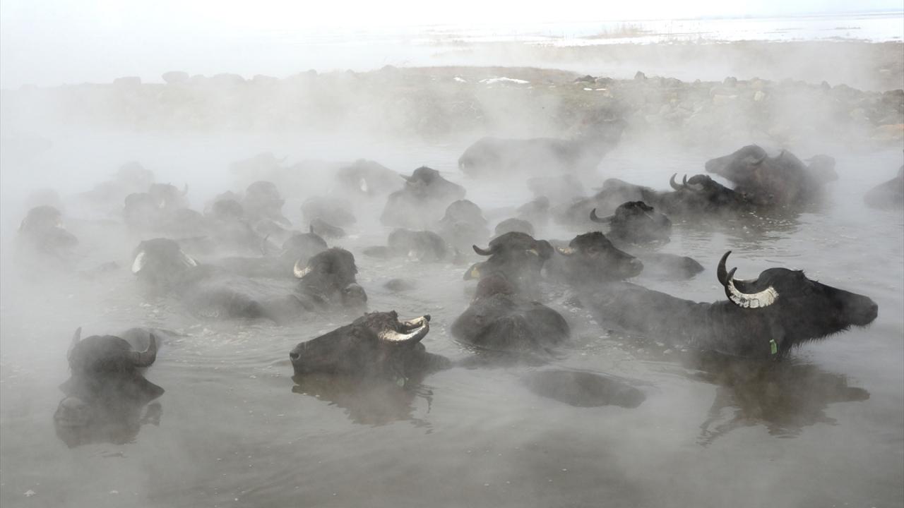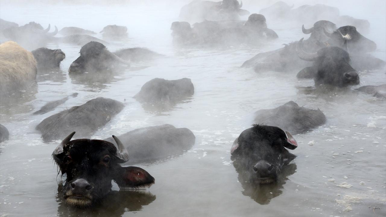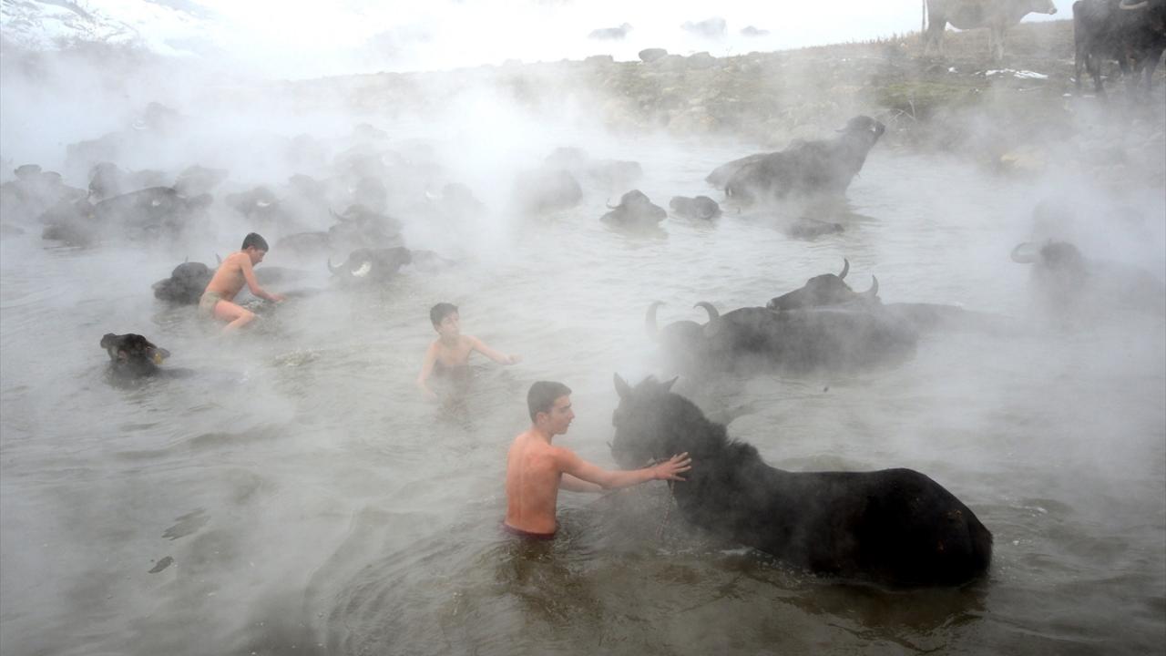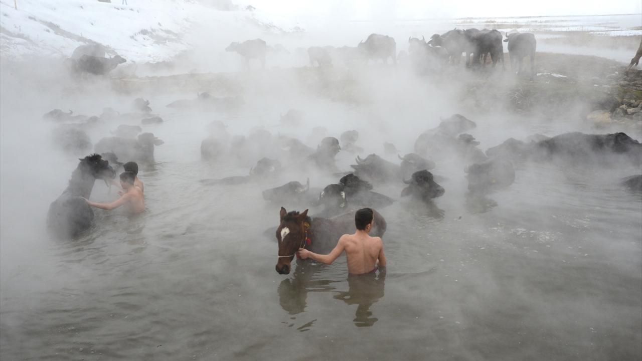 Sıcaklığın sıfırın altında 20 dereceye kadar düştüğü bölgede, etrafı karla kaplı kaplıcaya getirilen manda ve atların buharların yükseldiği suda yıkanması renkli görüntüler oluşturuyor.