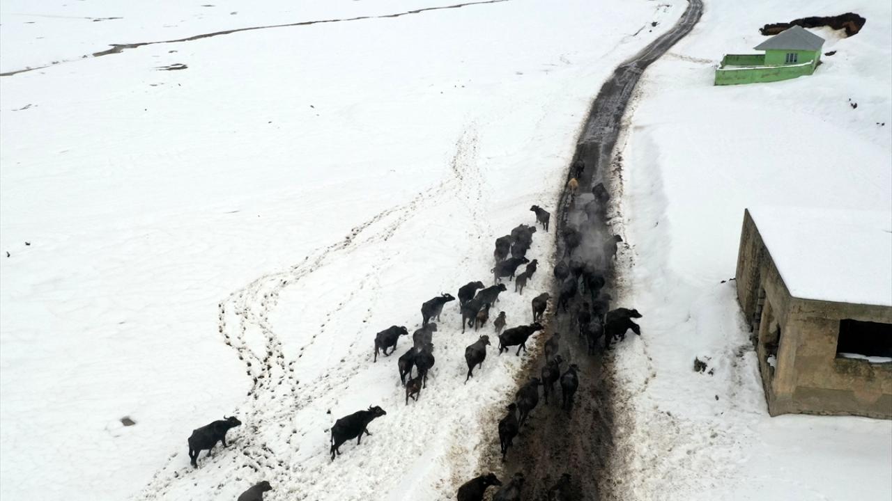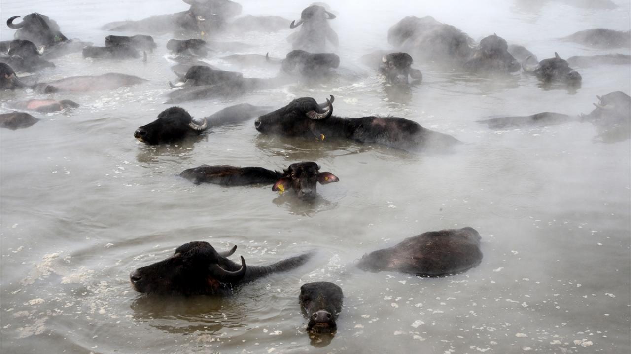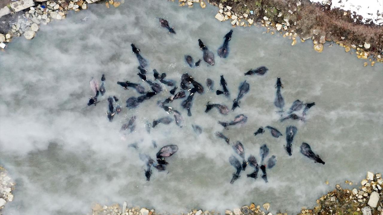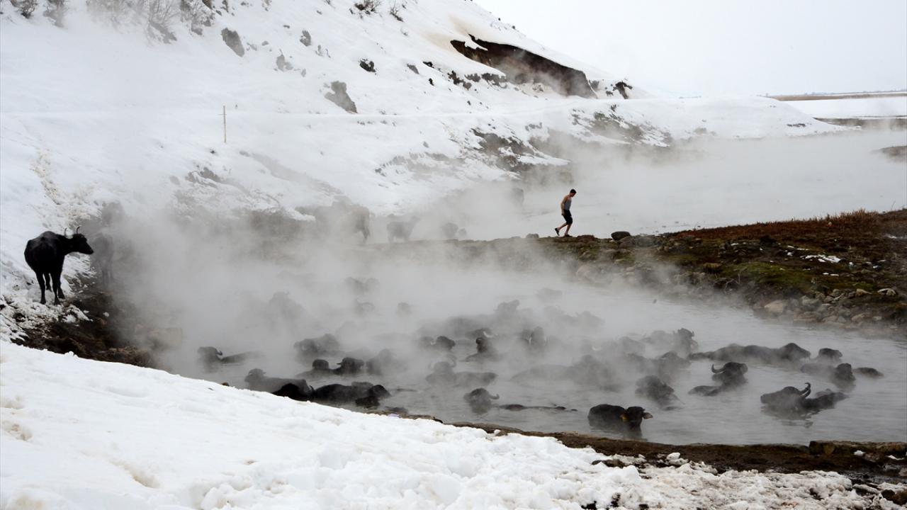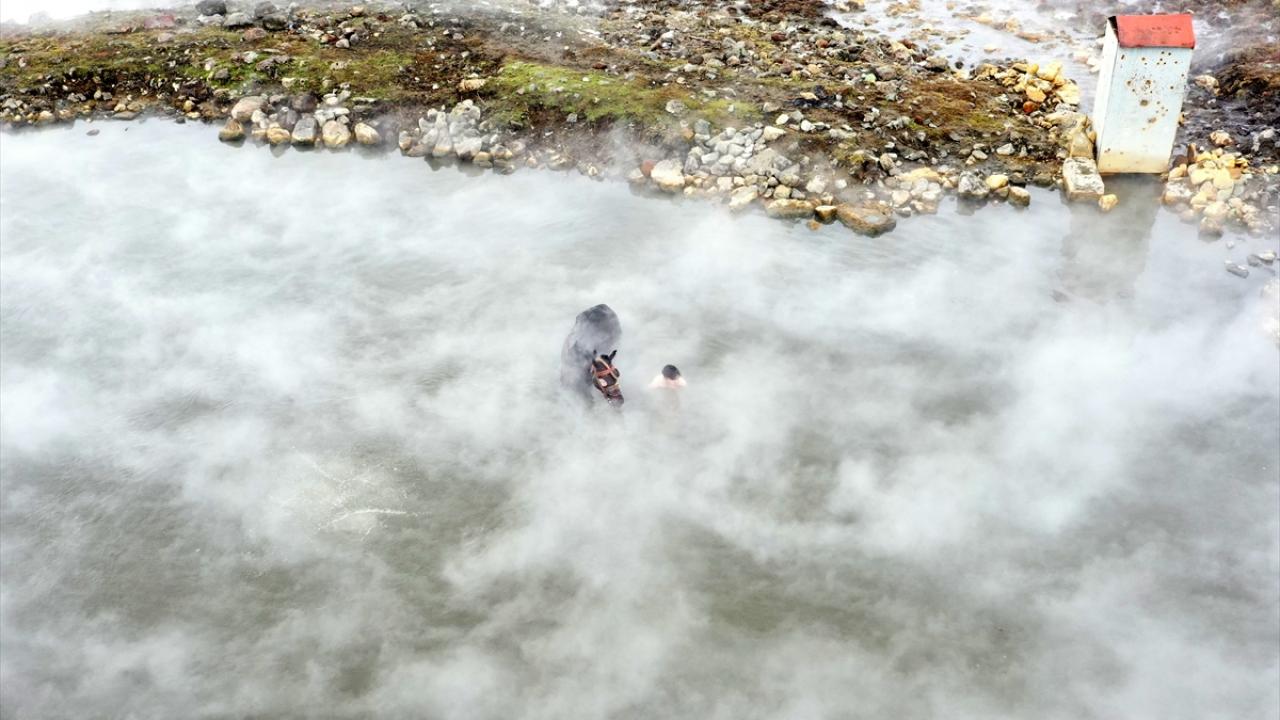 Sıcaklığın sıfırın altında 20 dereceye kadar düştüğü bölgede, etrafı karla kaplı kaplıcaya getirilen manda ve atların buharların yükseldiği suda yıkanması renkli görüntüler oluşturuyor.