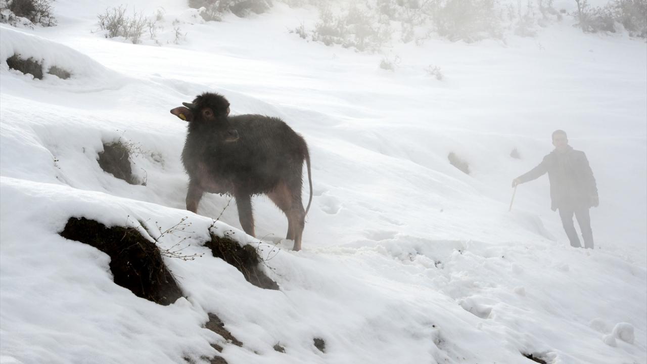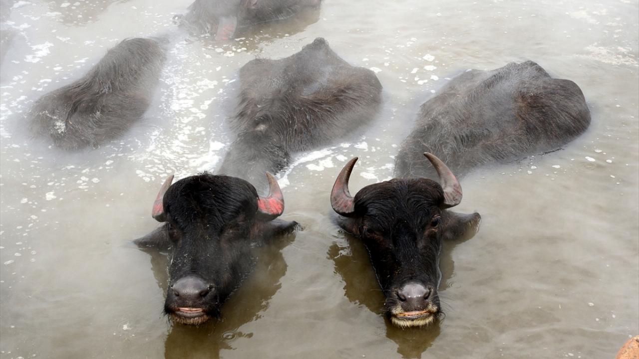 Olumsuz hava koşullarının etkili olduğu köyde dışarıya çıkarılamadıkları için ahırlarda kirlenen mandalar, daha sağlıklı olmaları ve süt verimi için belli aralıklarla kaplıca suyunda yıkanıyor.