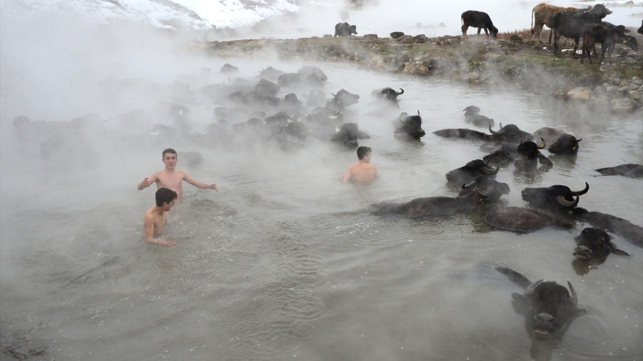 Sıcak suyun hayvanlara iyi geldiğini, verimlerinin arttığını belirten Azbay, "Soğuk hava gebe olan mandalara zarar veriyor. Bu nedenle daha çok havanın güneşli olduğu günlerde geliyoruz. 20 mandamız var. Onları yıkayıp temizliyoruz. Köyümüzde bin manda var. Bu nedenle belli aralıklarla geliyoruz." dedi.