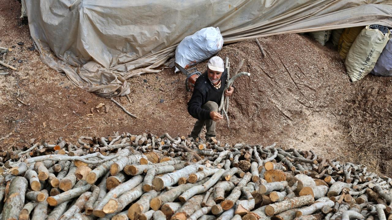 Odunları parçalara ayırarak çadırlarının yakınındaki ocaklara getiren aileler, odunları arasına saman koyarak üst üste yerleştiriyor.