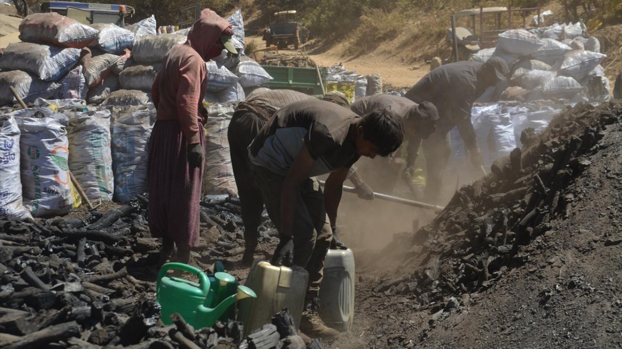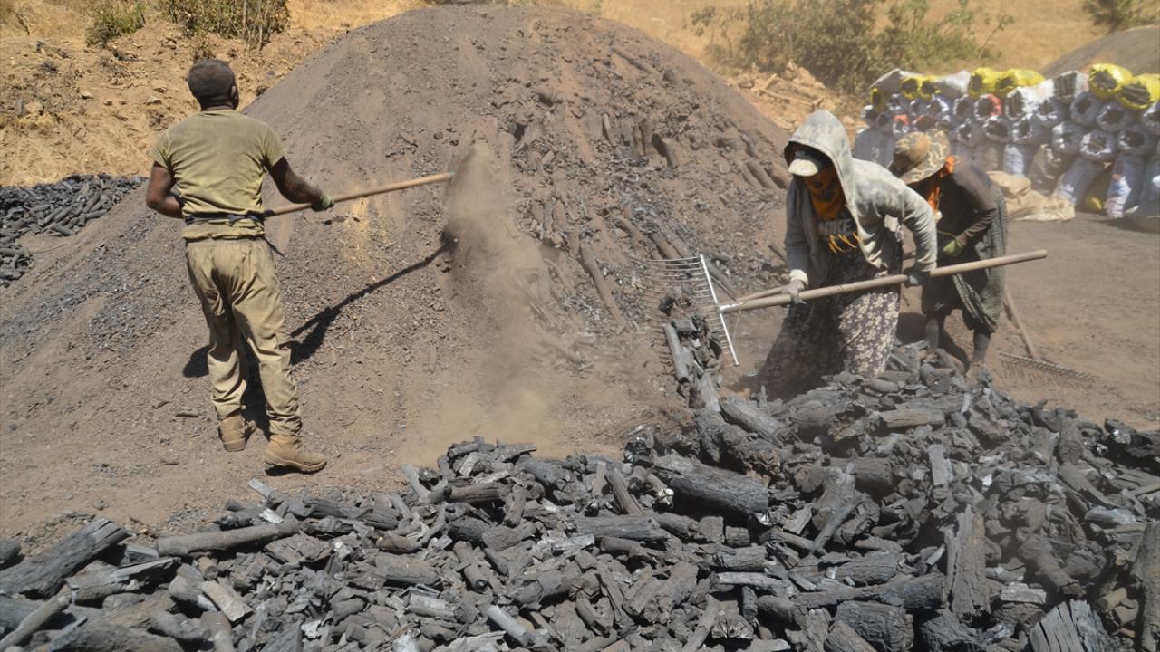 İşçiler, sıcak hava ve yakılan kömürün yaydığı ısıya rağmen günlerce mangal kömürü elde ediyor.