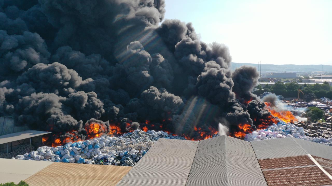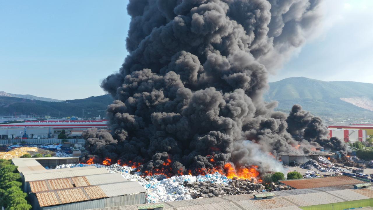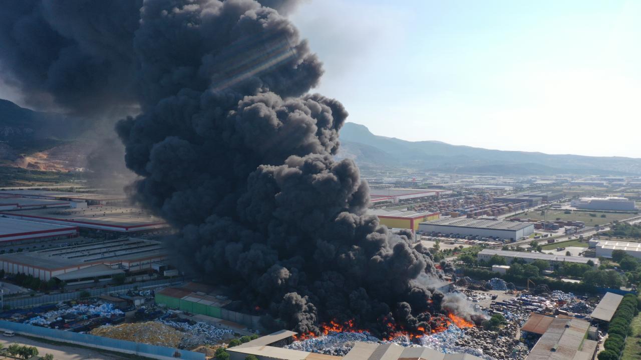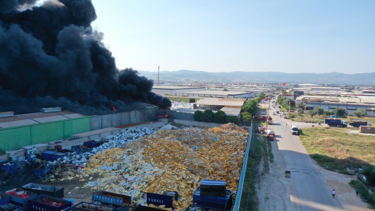 Manisa'da, Muradiye Organize Sanayi Bölgesi'nde (OSB) geri dönüşüm ve demir çelik üretimi yapılan fabrikada henüz belirlenemeyen nedenle çıkan yangına, müdahale ediliyor