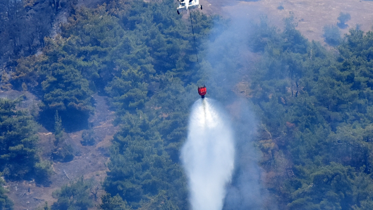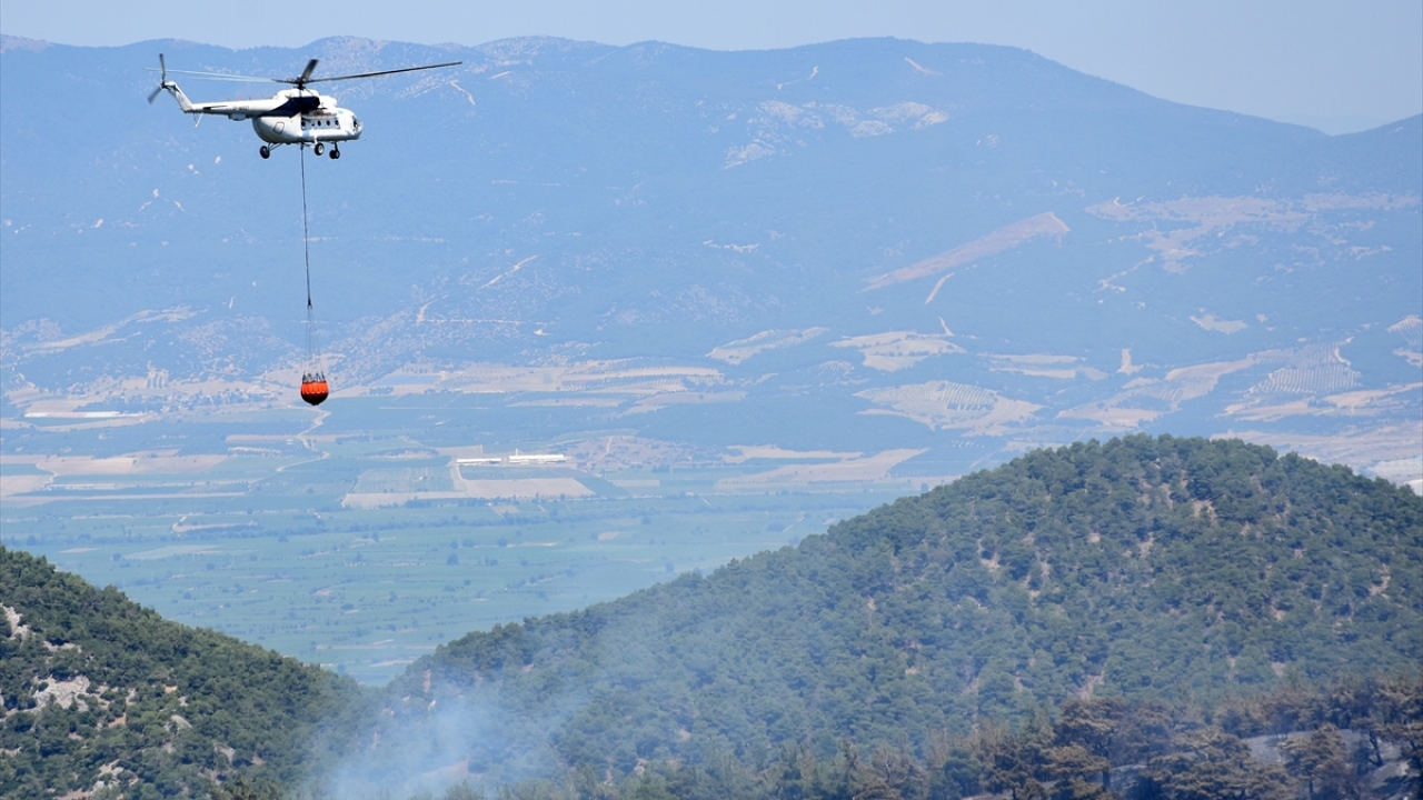 Bu sabah İzmir Orman Bölge Müdürlüğüne bağlı 8 yangın söndürme helikopteri, 2 amfibik yangın söndürme uçağı ve 21 arazöz soğutma çalışmalarına başladı. (Fotoğraf: AA)