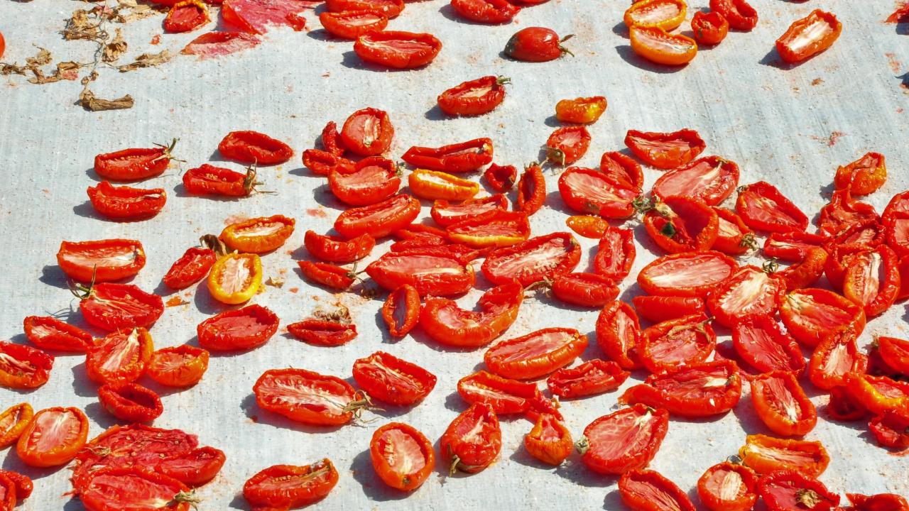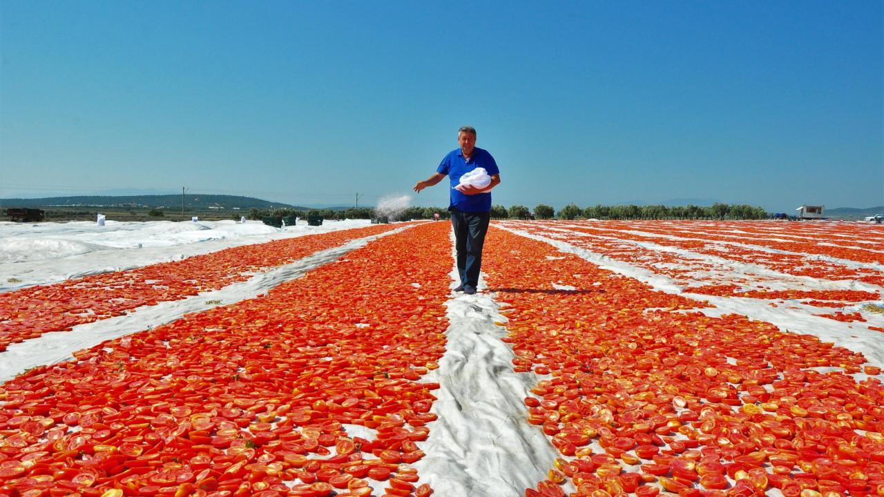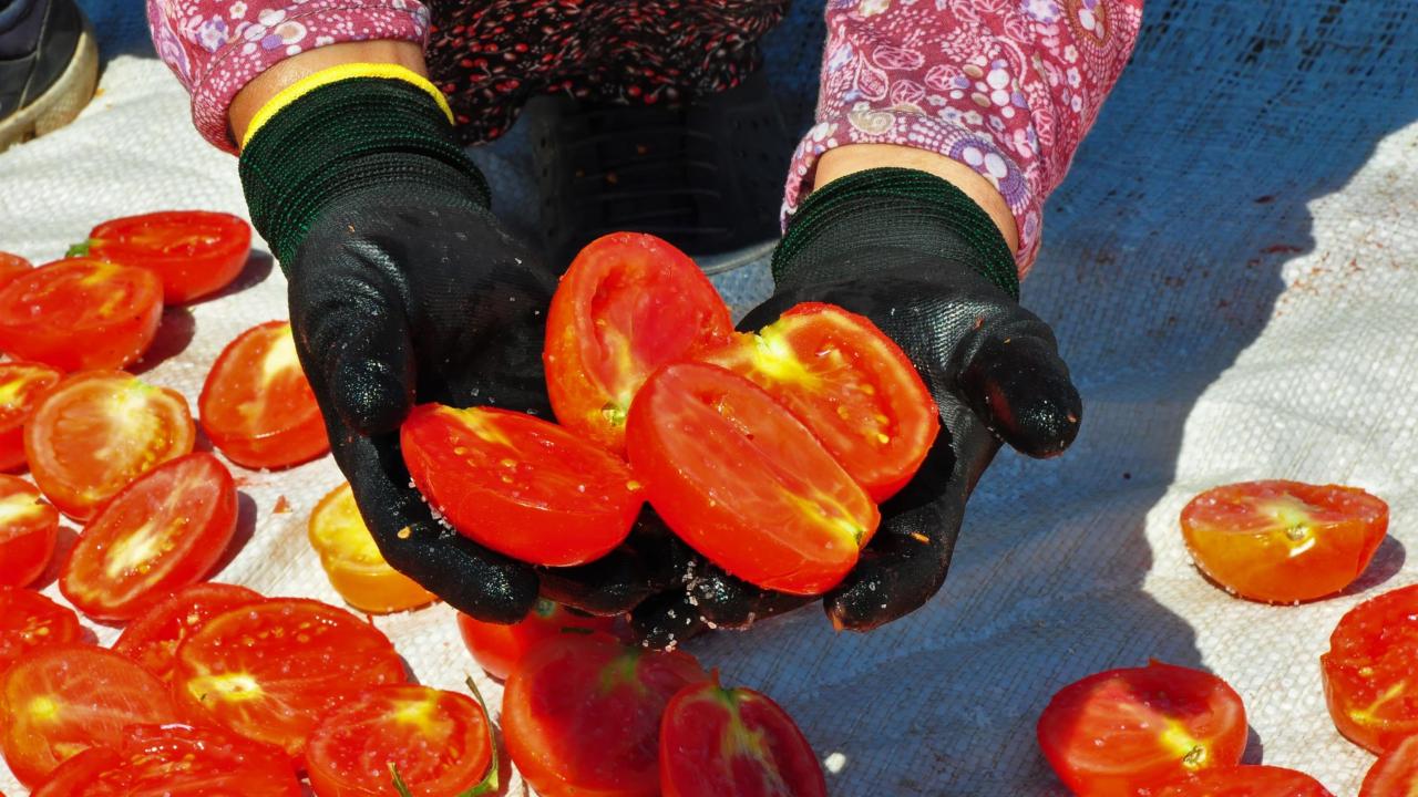 Tuzlama işleminin ardından 1 hafta boyunca kurumaya bırakılan domatesler, daha sonra tesislere getirilerek işleniyor.