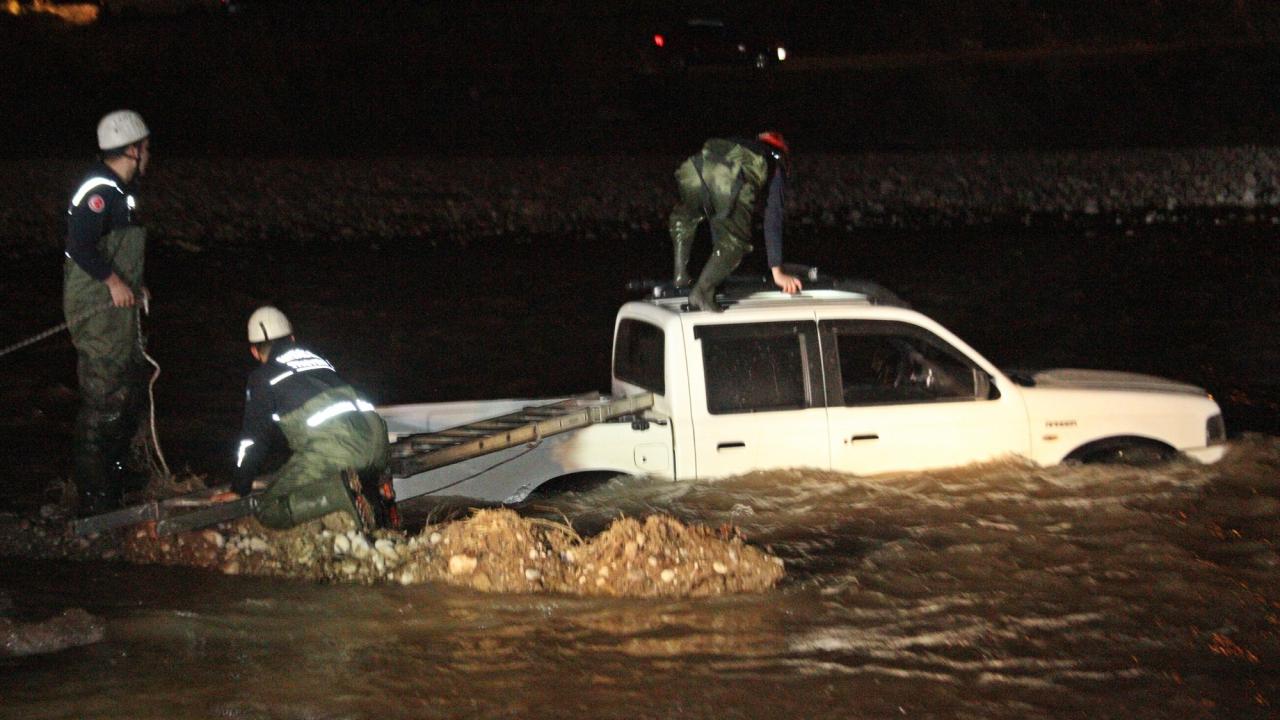 Araçta mahsur kalan 3 kişi durumu 112 Acil Çağrı Merkezine bildirdi. Olay yerine gelen itfaiye ekipleri iplerle araca ulaşmaya çalıştı.