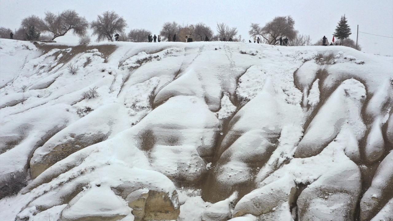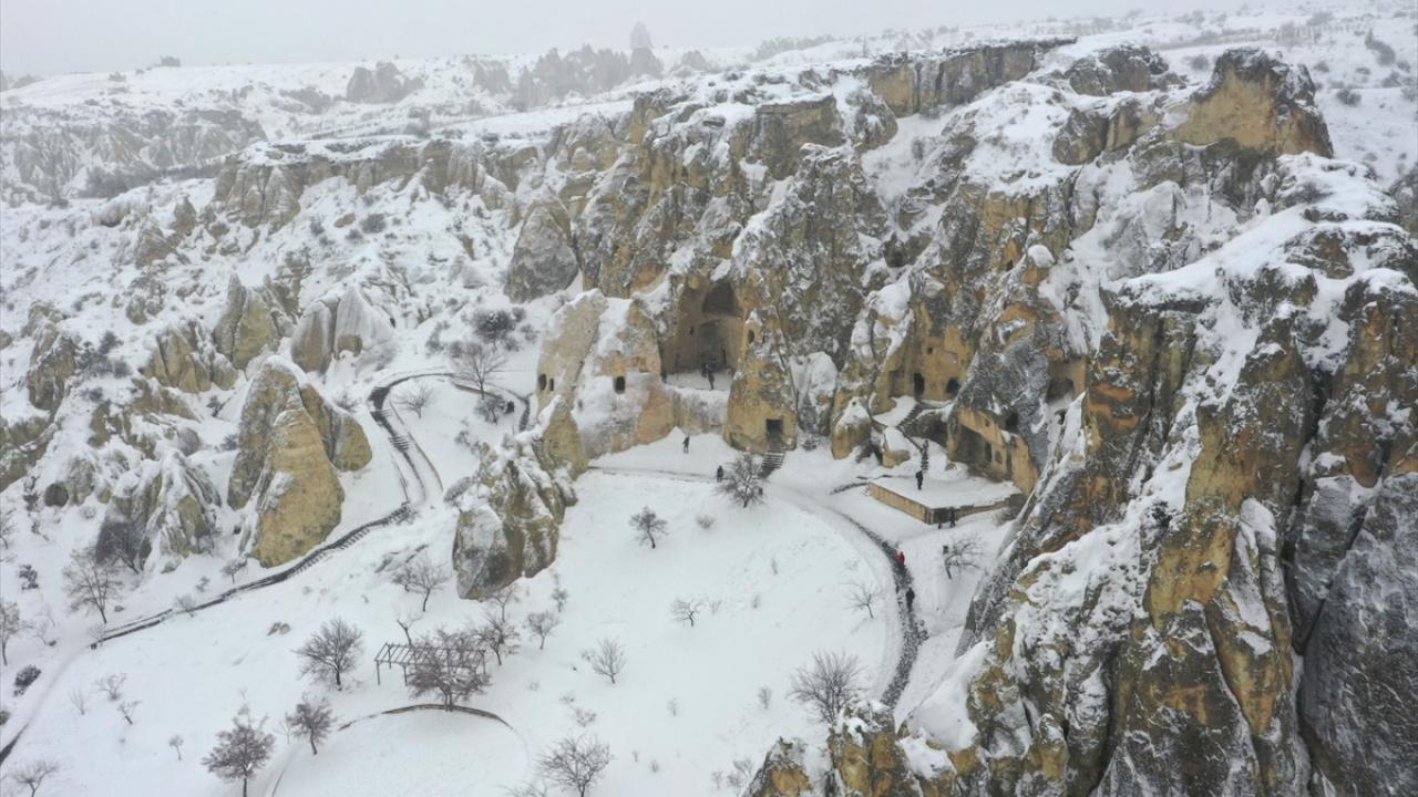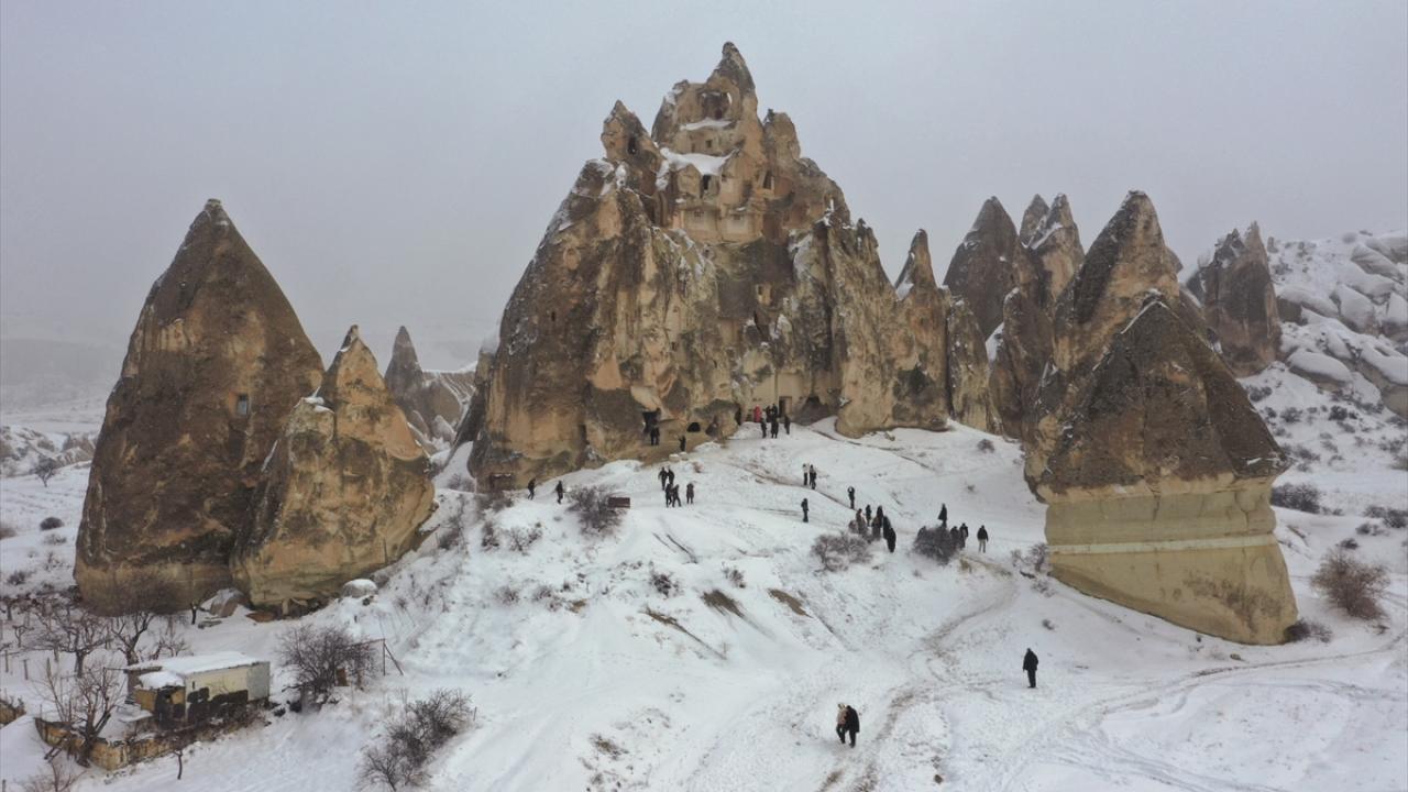 Tarihi, kültürel ve doğal güzellikleriyle turistlerin yılın her mevsimi ziyaret ettiği Kapadokya`da kar yağışı aralıklarla sürüyor.