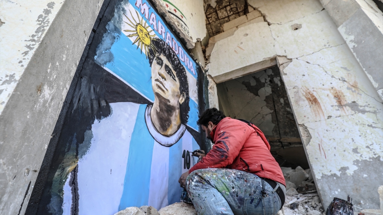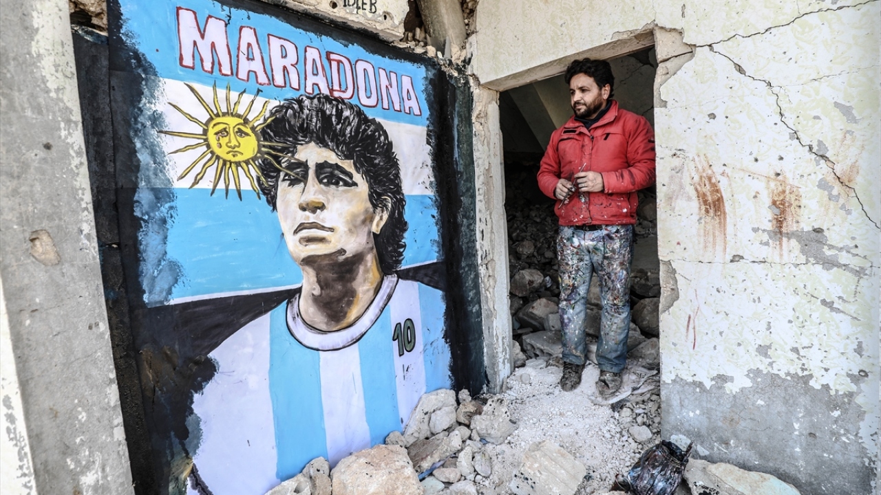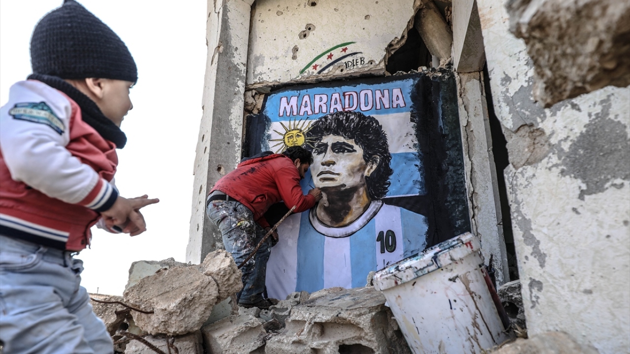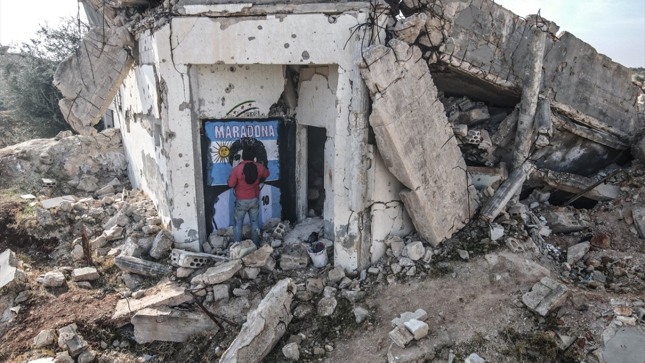 Maradona'nın resmi İdlib'de yıkılan bir evin duvarına çizildi