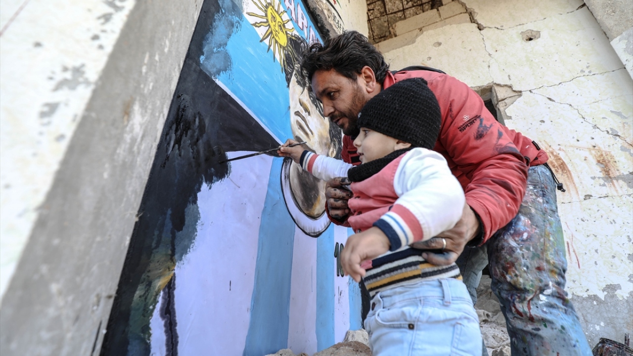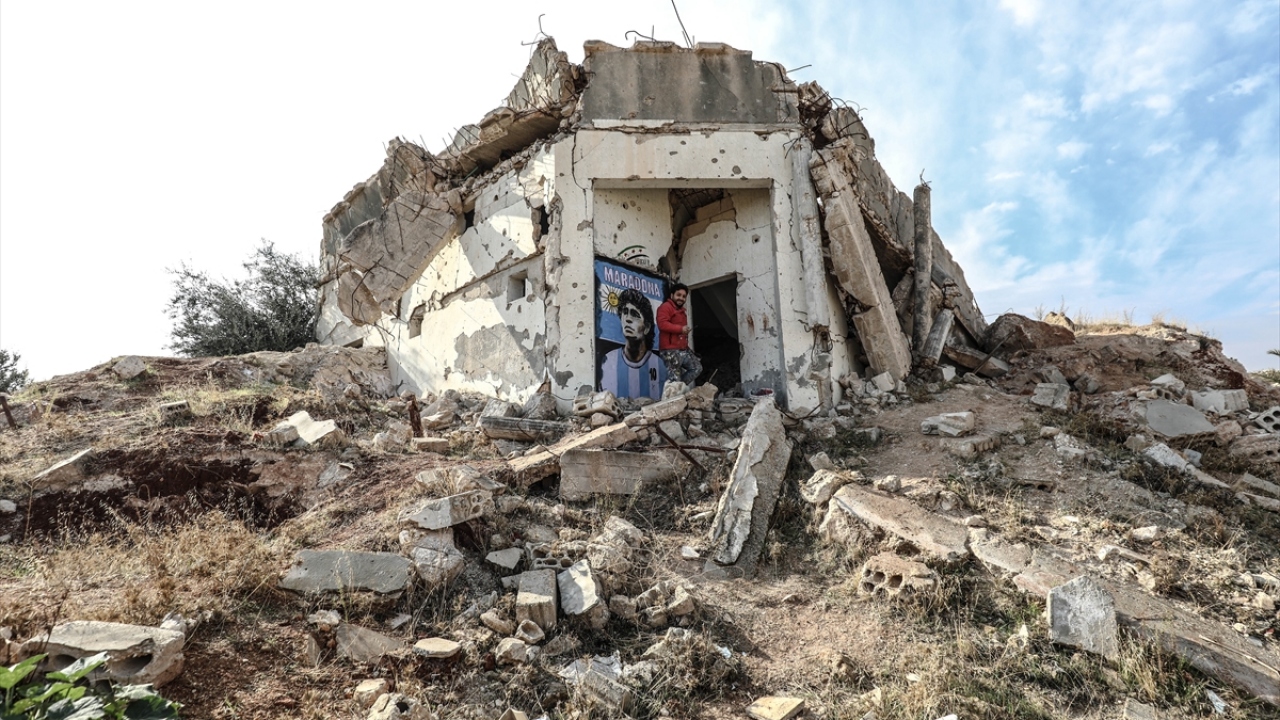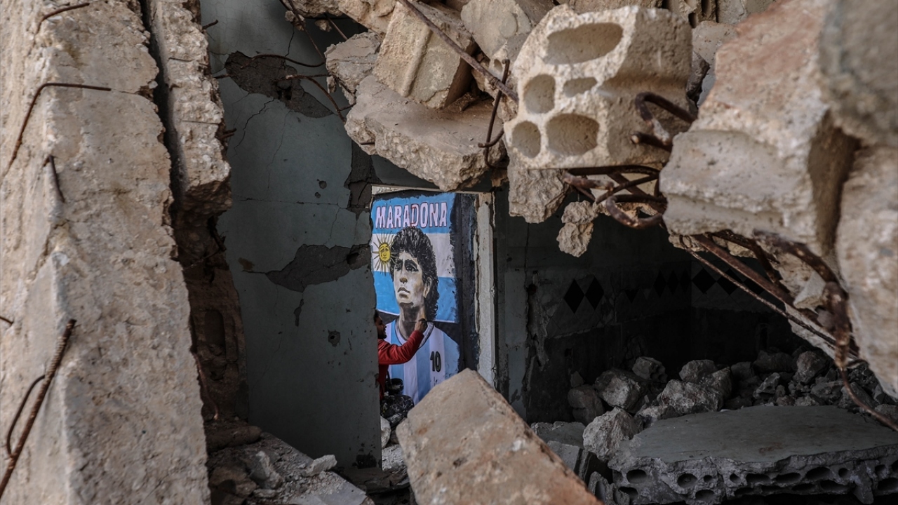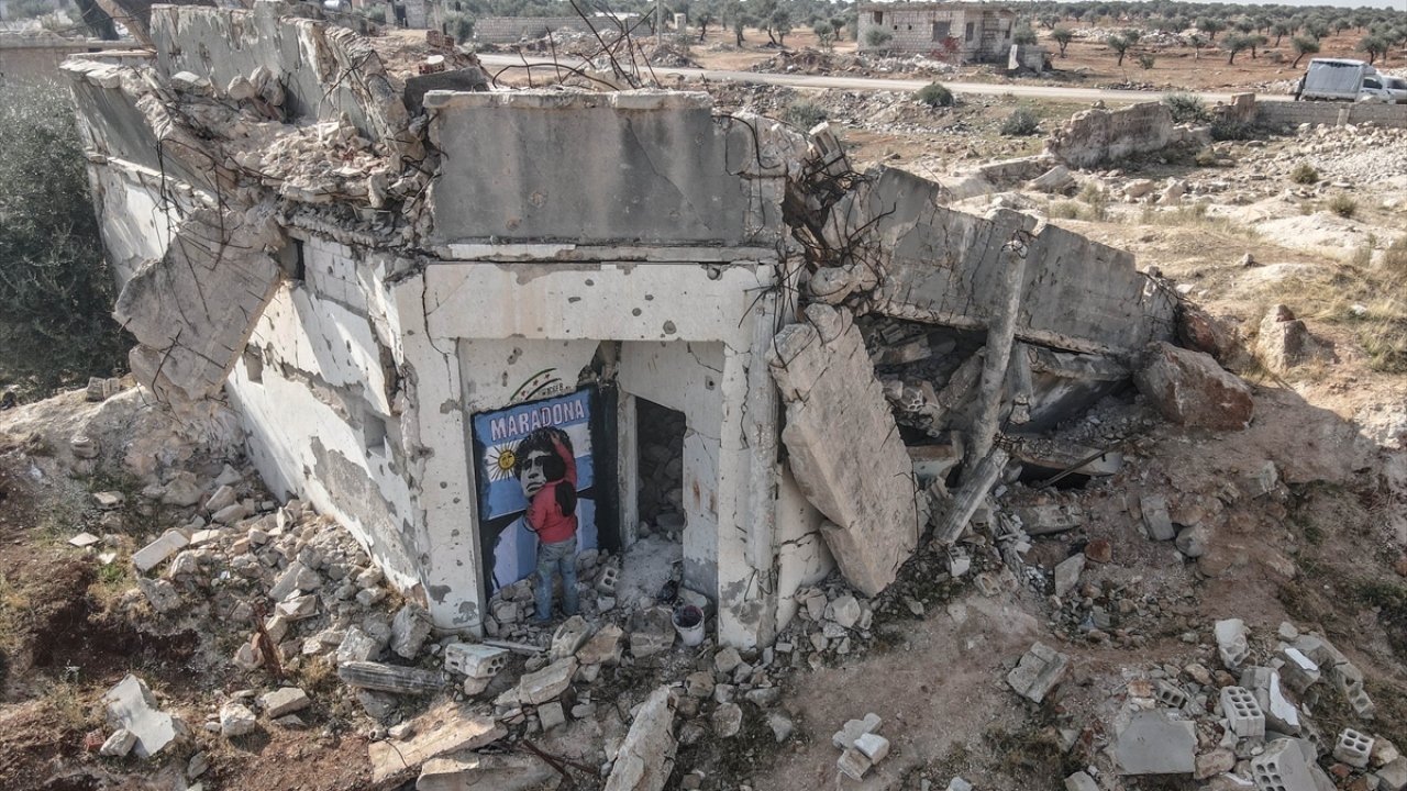 Maradona'nın resmi İdlib'de yıkılan bir evin duvarına çizildi