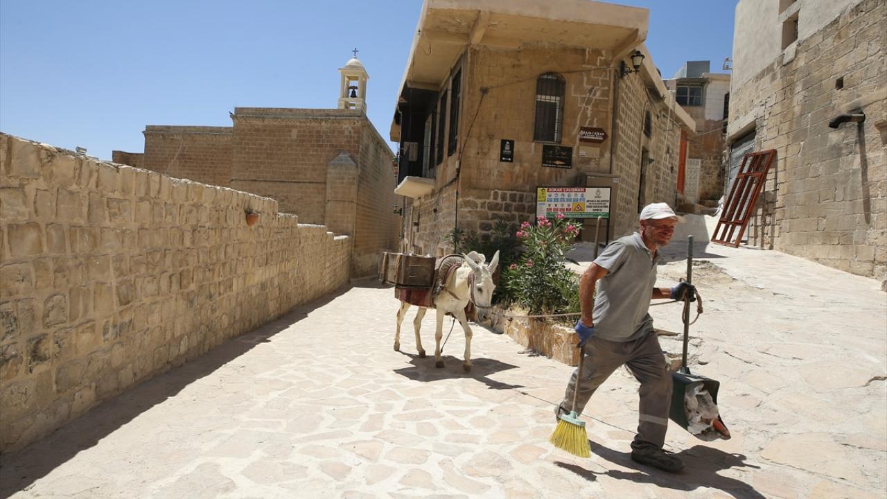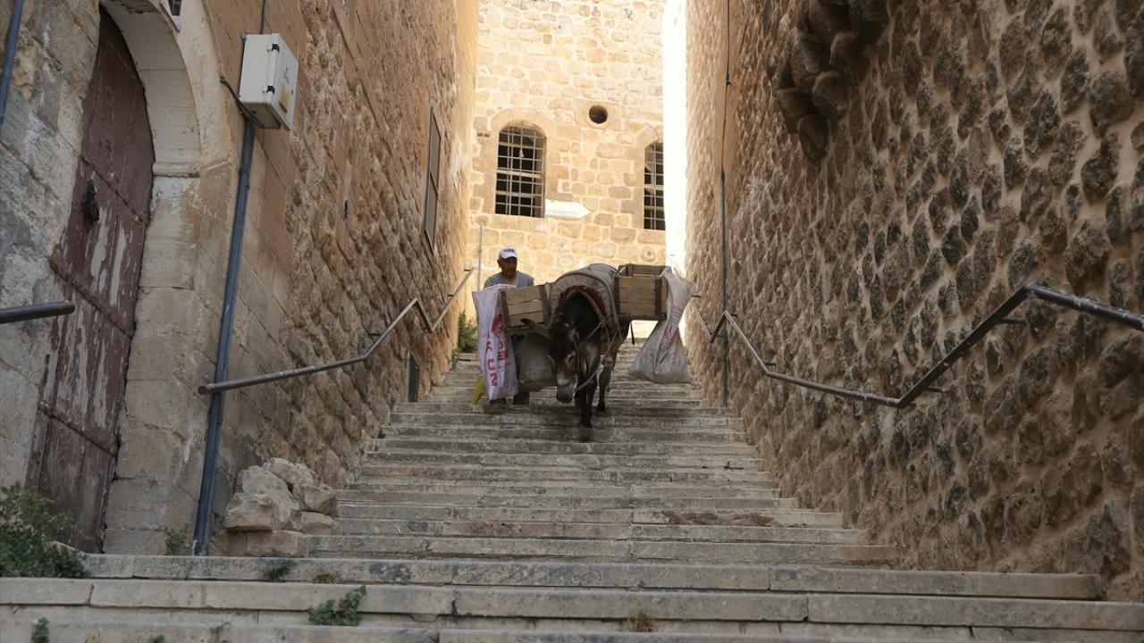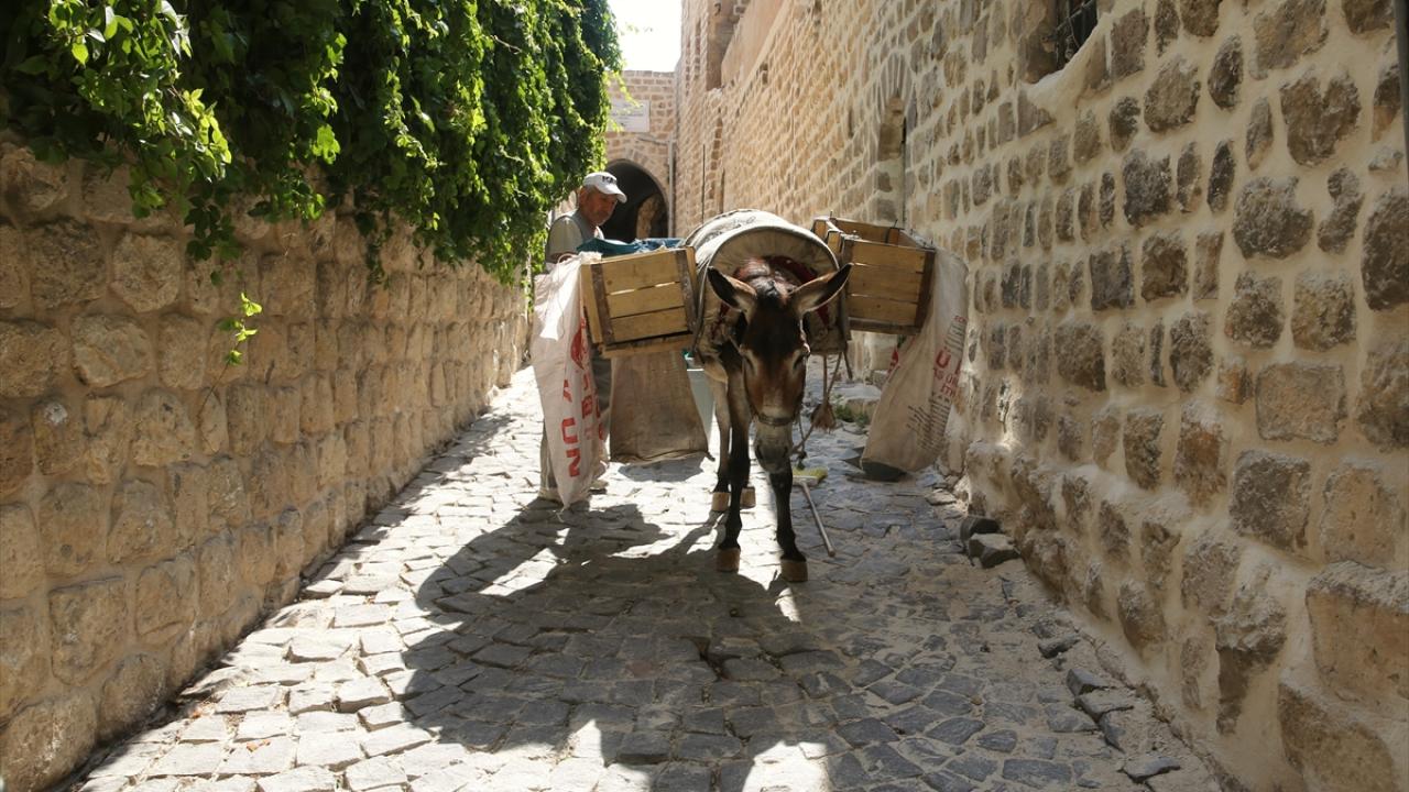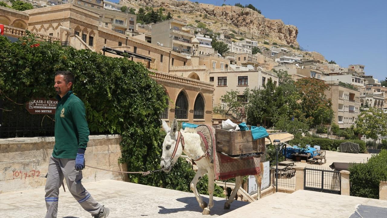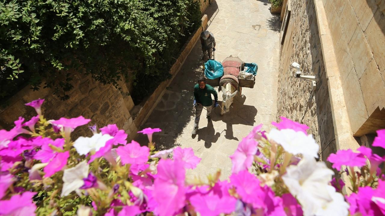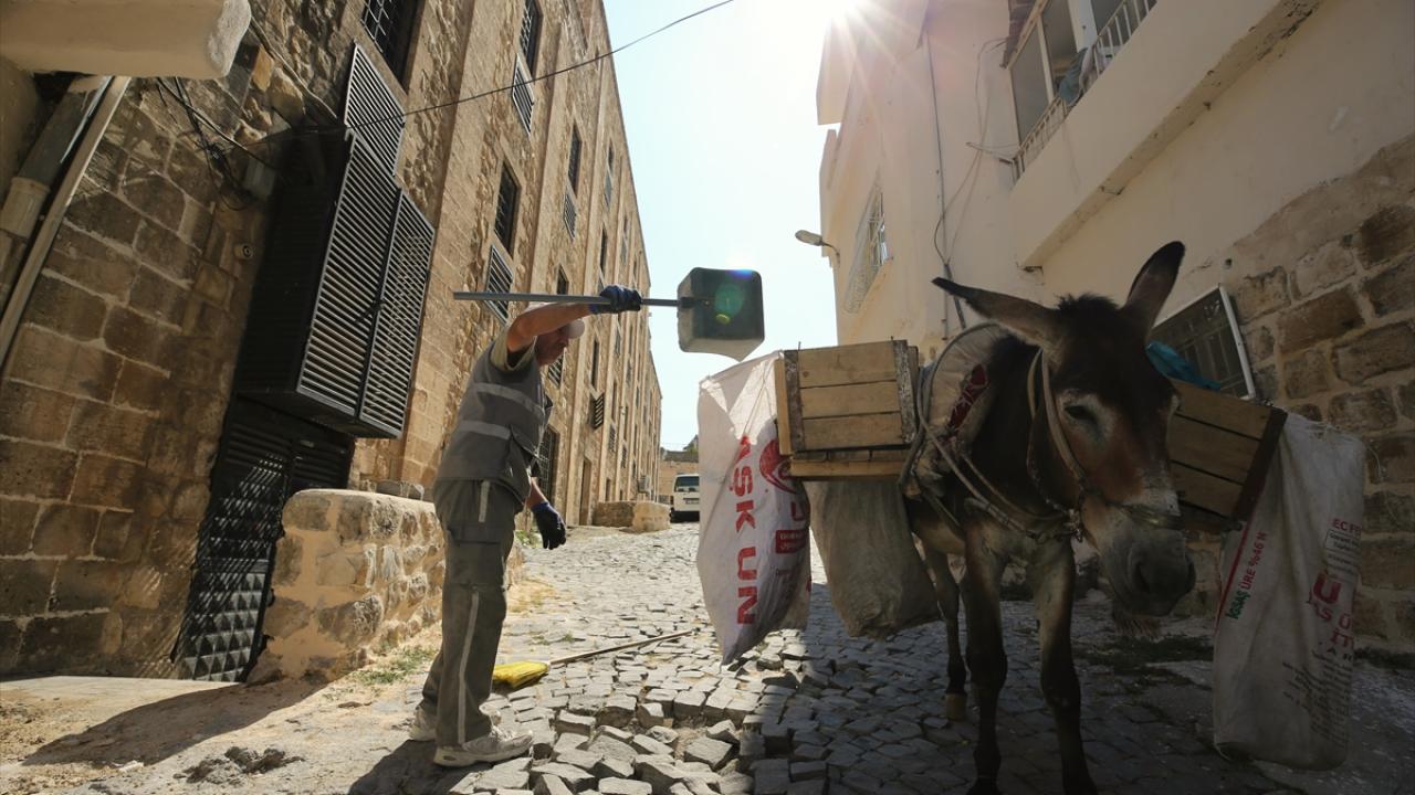 Mardin'in Artuklu ilçesinde sit alanındaki sokakların dar ve merdivenli olması nedeniyle çöplerin toplanmasında kullanılan eşekler için yaz mesaisi uygulamasına geçildi.