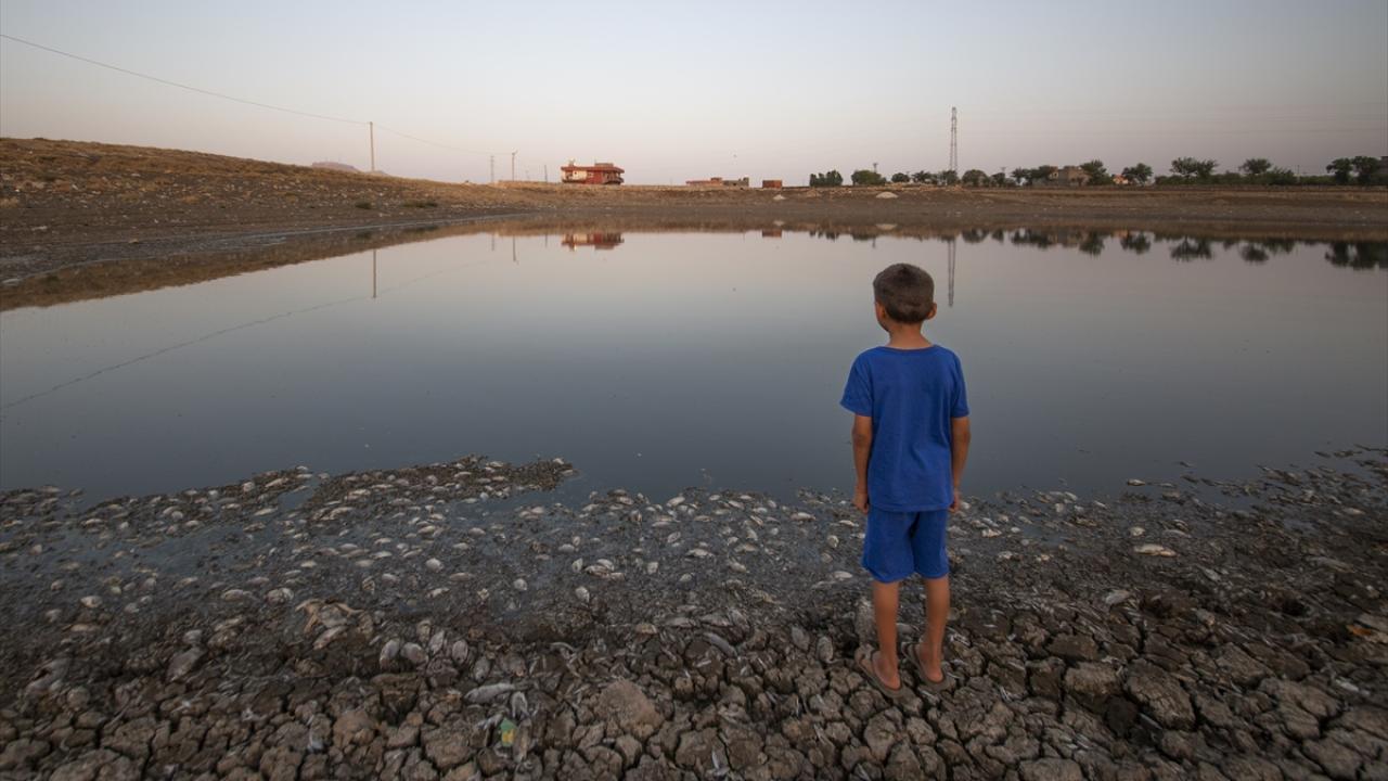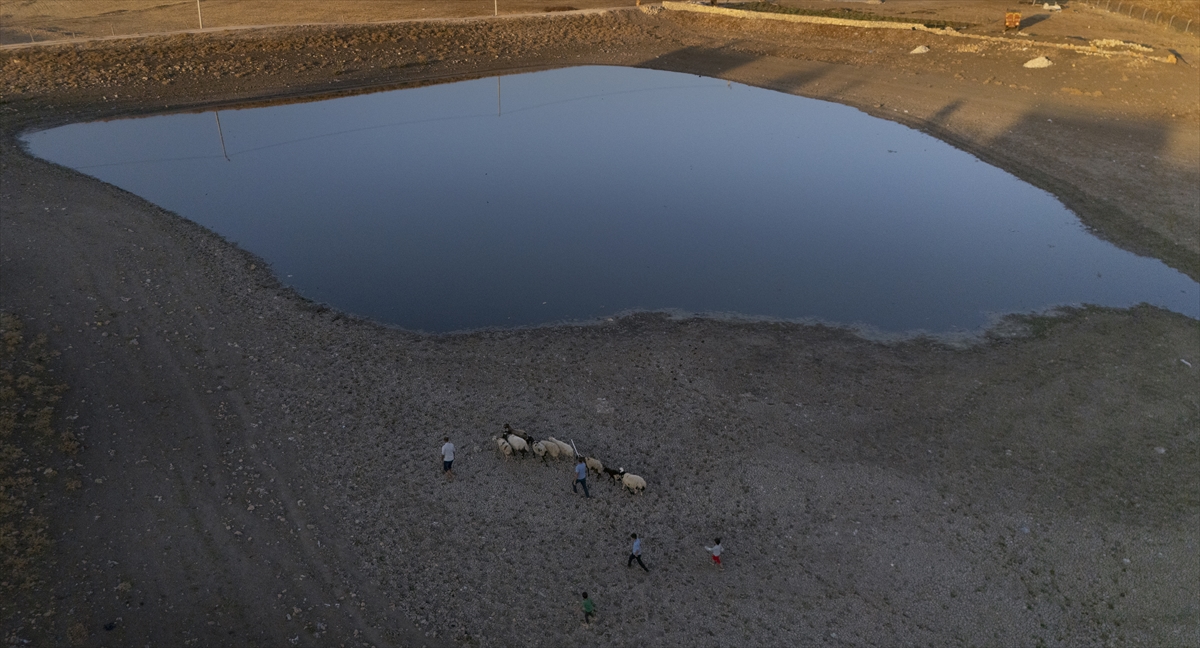 Mardin’in Derik ve Mazıdağı ilçeleri arasında yer alan Şanlı Mahallesi’ndeki gölet, uzun süredir yağış görülmemesi ve aşırı sıcaklar nedeniyle kuruma noktasına geldi.