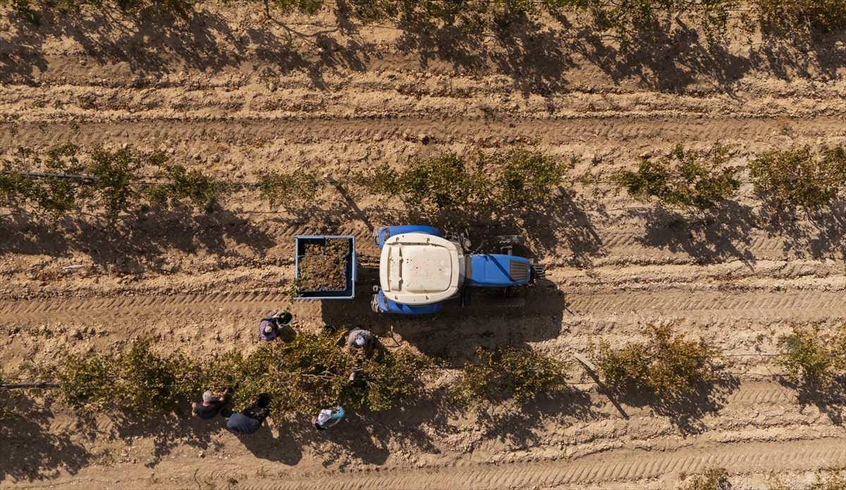 Bu geleneksel üretim öncesinde, ilçedeki bağlarda üzümler hasat edilerek traktörlere yükleniyor.