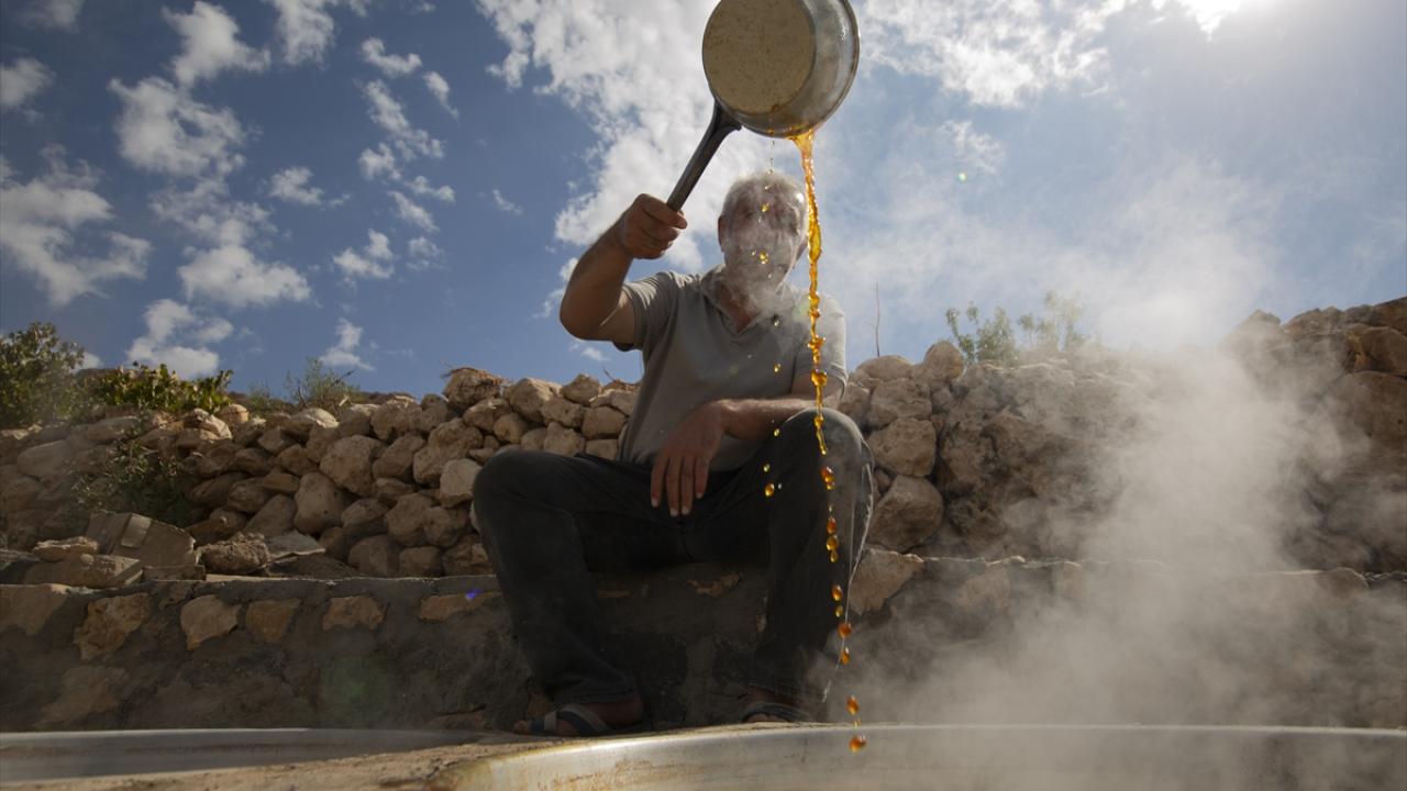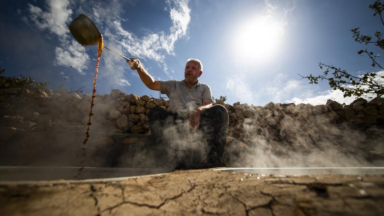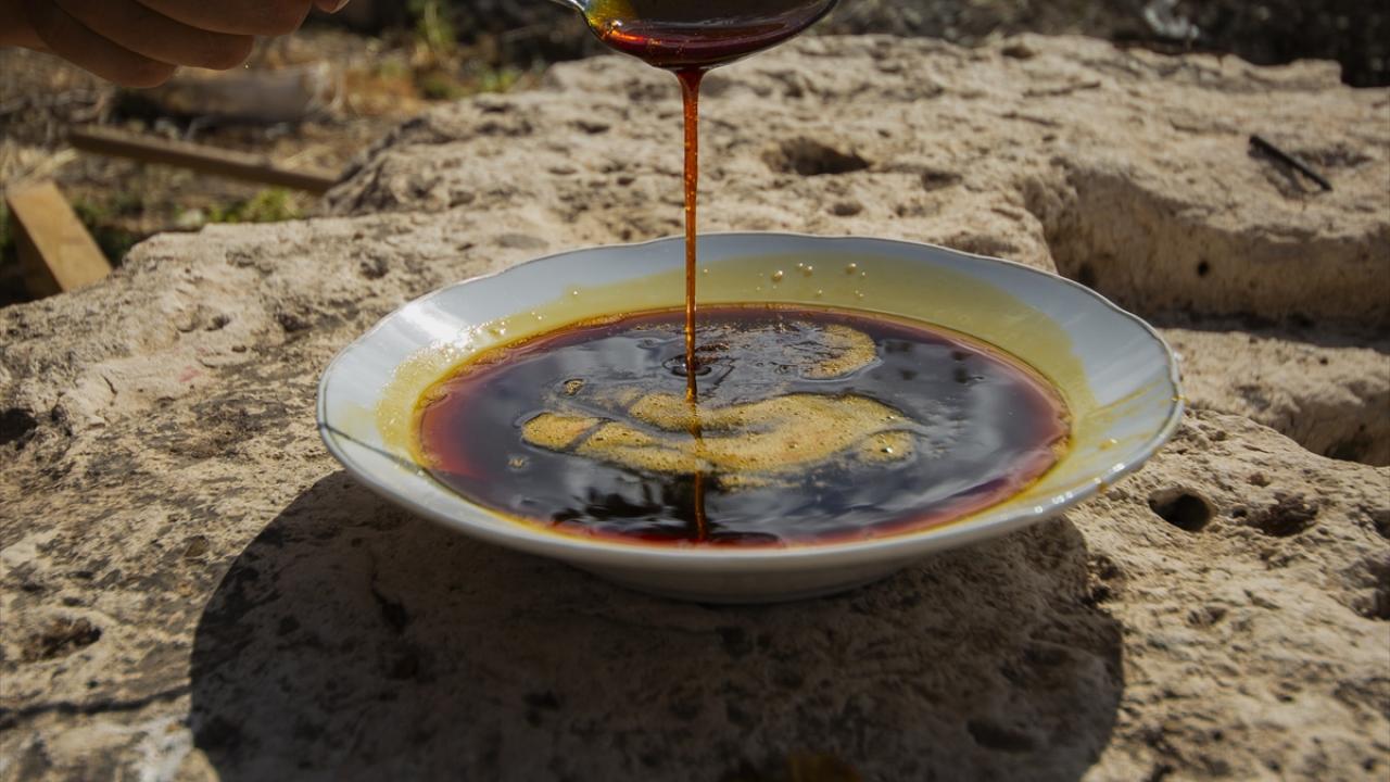 Bağlardan özenle toplanan mezrone üzümleri, özel havuzlarda sıkılarak elde edilen şıranın iki kez kaynatılmasıyla pekmeze dönüştürülüyor.