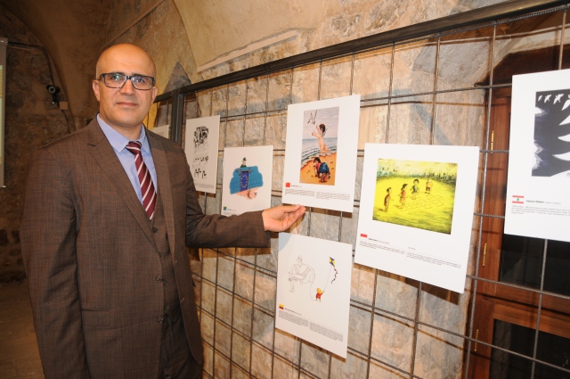 Mardin'de Bodrum'dan Kos'a botla gitmeye çalışan ve boğularak ölen 3 yaşındaki Aylan Kurdi'nin karikatürünün de bulunduğu 'Ortadoğu'da Kardeşlik' konulu karikatür sergisi açıldı.
