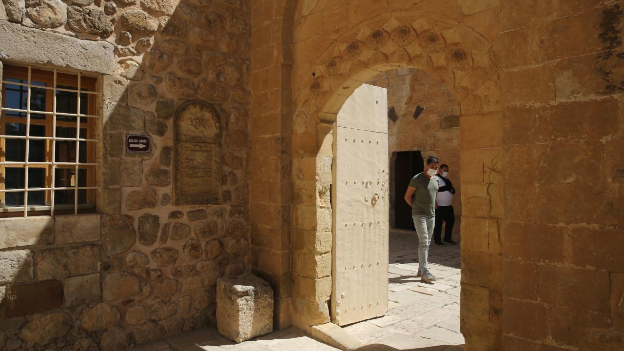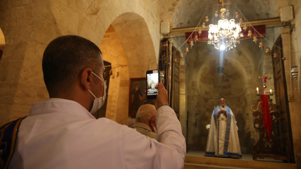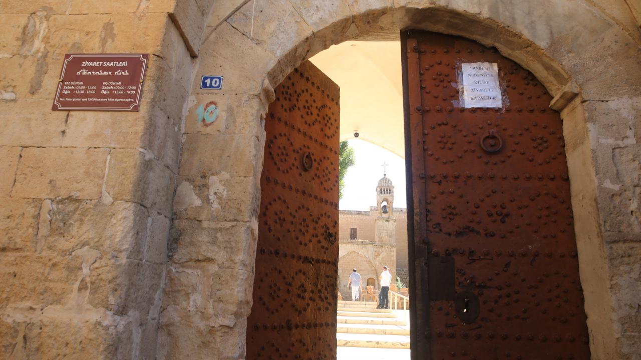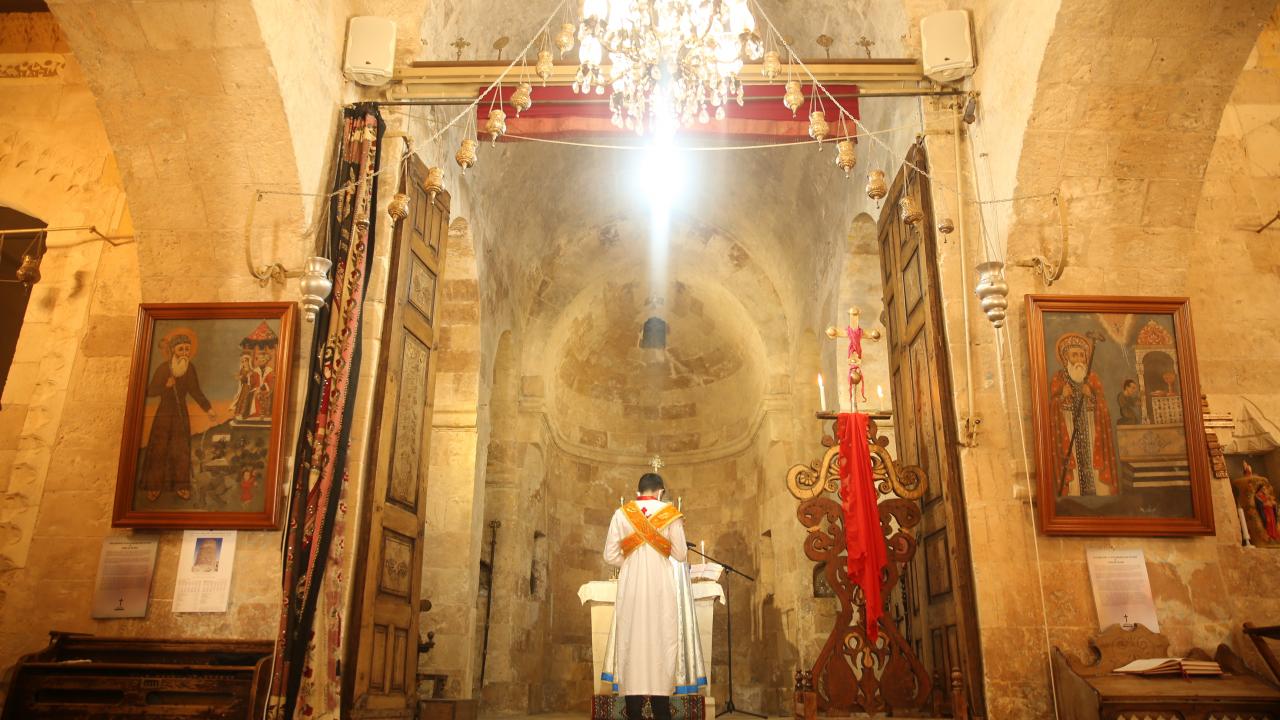 Mardin'de tarihi Kırklar Kilisesi'nde din adamları, koronavirüs önlemleri kapsamında sosyal mesafe kuralına uyarak Paskalya Bayramı dolayısıyla ayin düzenledi.