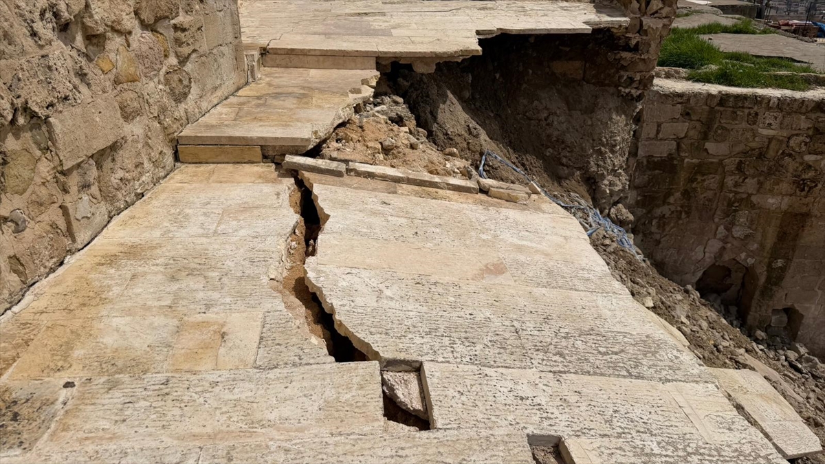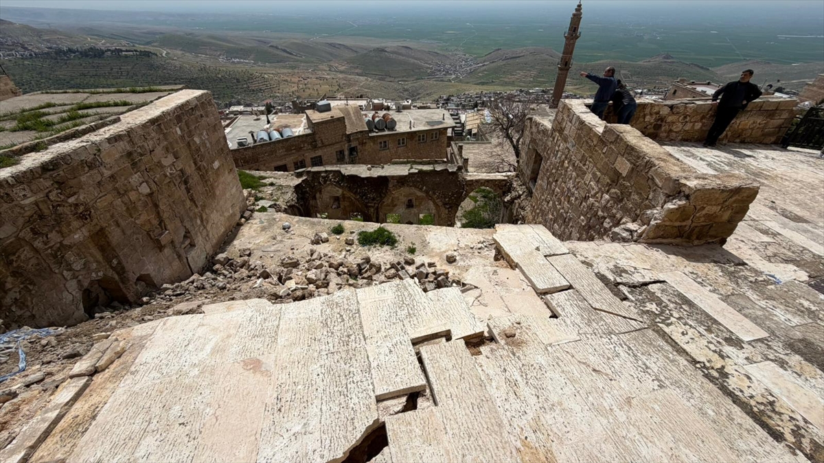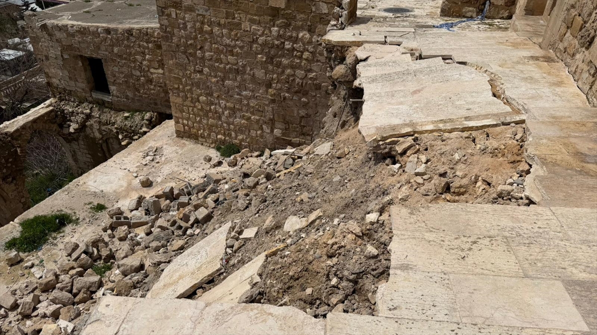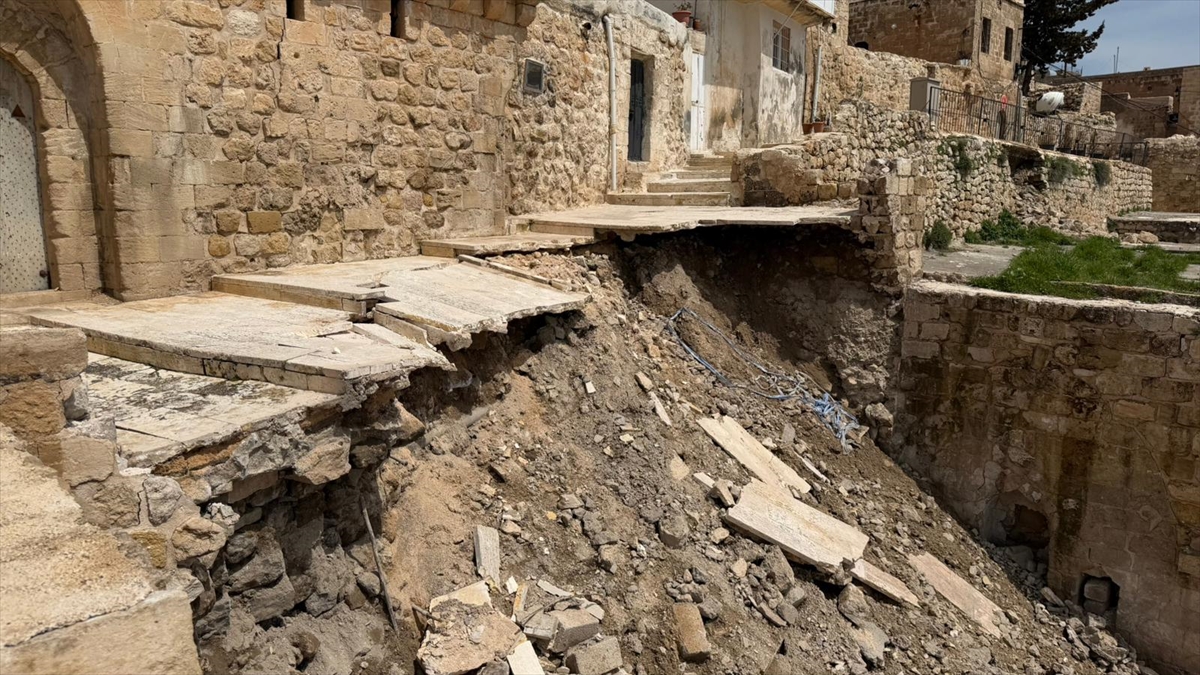 Mardin'in merkez Artuklu ilçesinde yoğun yağış sonrası tarihi sit alanı içerisinde bulunan yolun bazı kısımlarında ve bir istinat duvarında çökme meydana geldi.