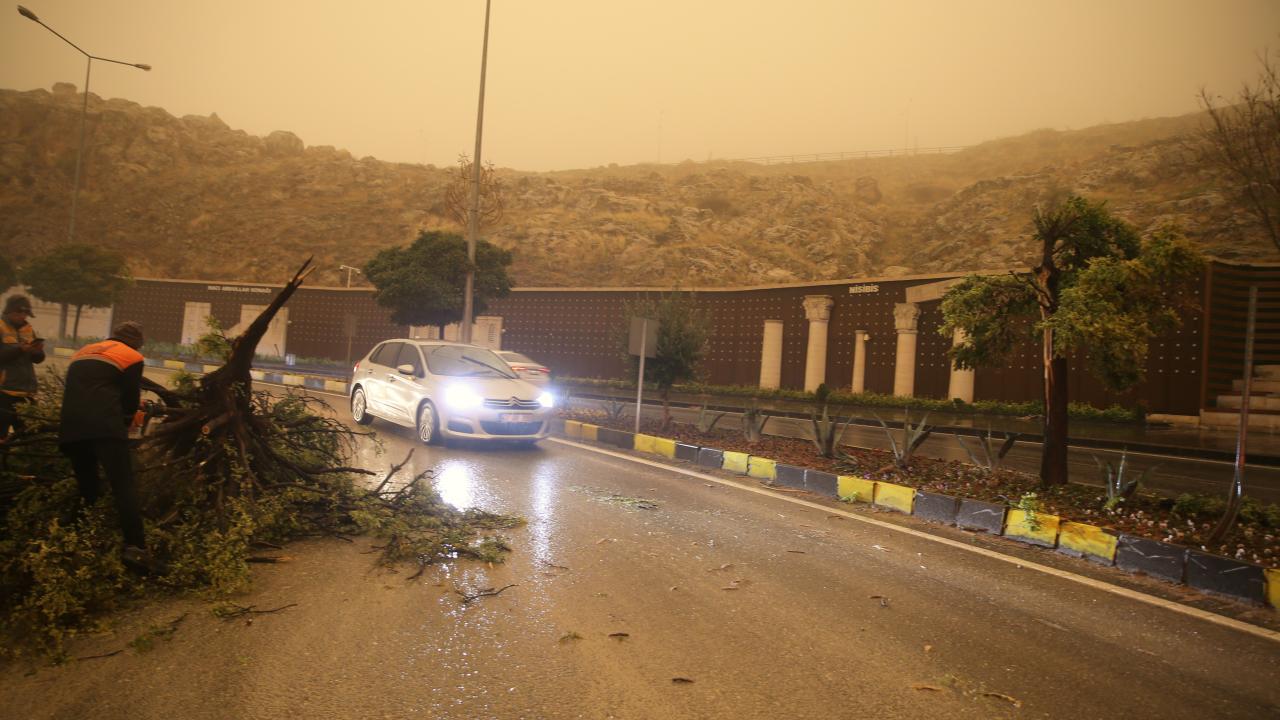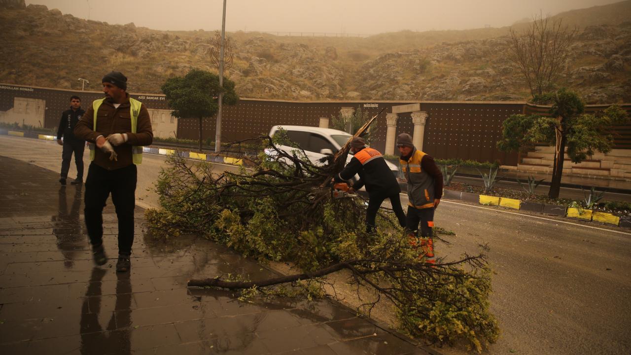 Mardin Büyükşehir Belediyesi ekipleri, merkez Artuklu ilçesinde kırılarak yola devrilen ağaçları kaldırarak, yolun açılmasını sağlıyor.