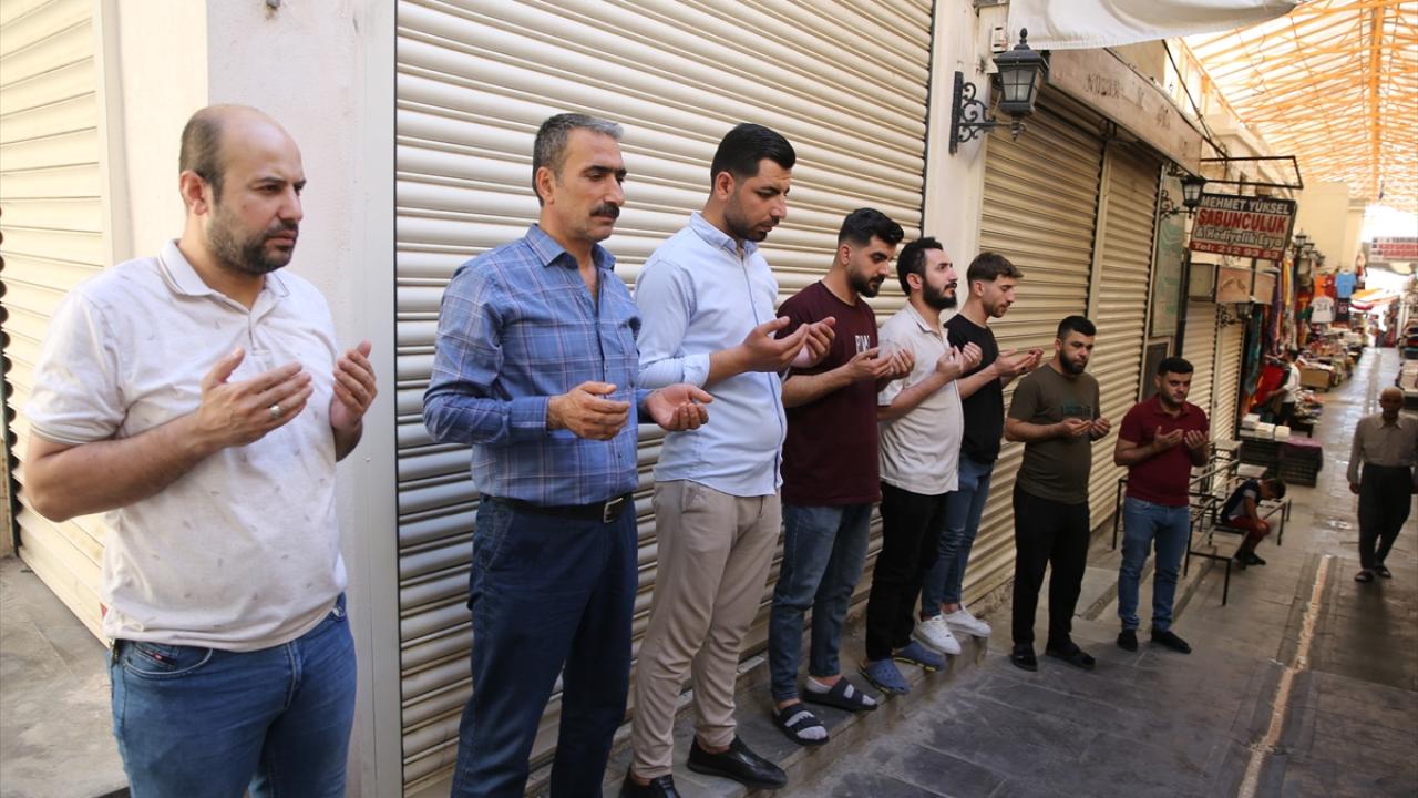 Merkez Artuklu ilçesinde bulunan tarihi Sokul Bakar, Kayseriye ve Hasan Ammar çarşılarında iş yerleri bulunan esnaf, 4 yıldır iş yerlerinin önünde Şirindede Camisi İmamı Fatih Yılmaz`ın öncülüğünde toplu dua ederek, hayırlı ve bereketli kazanç dileğiyle kepenk açıyor.