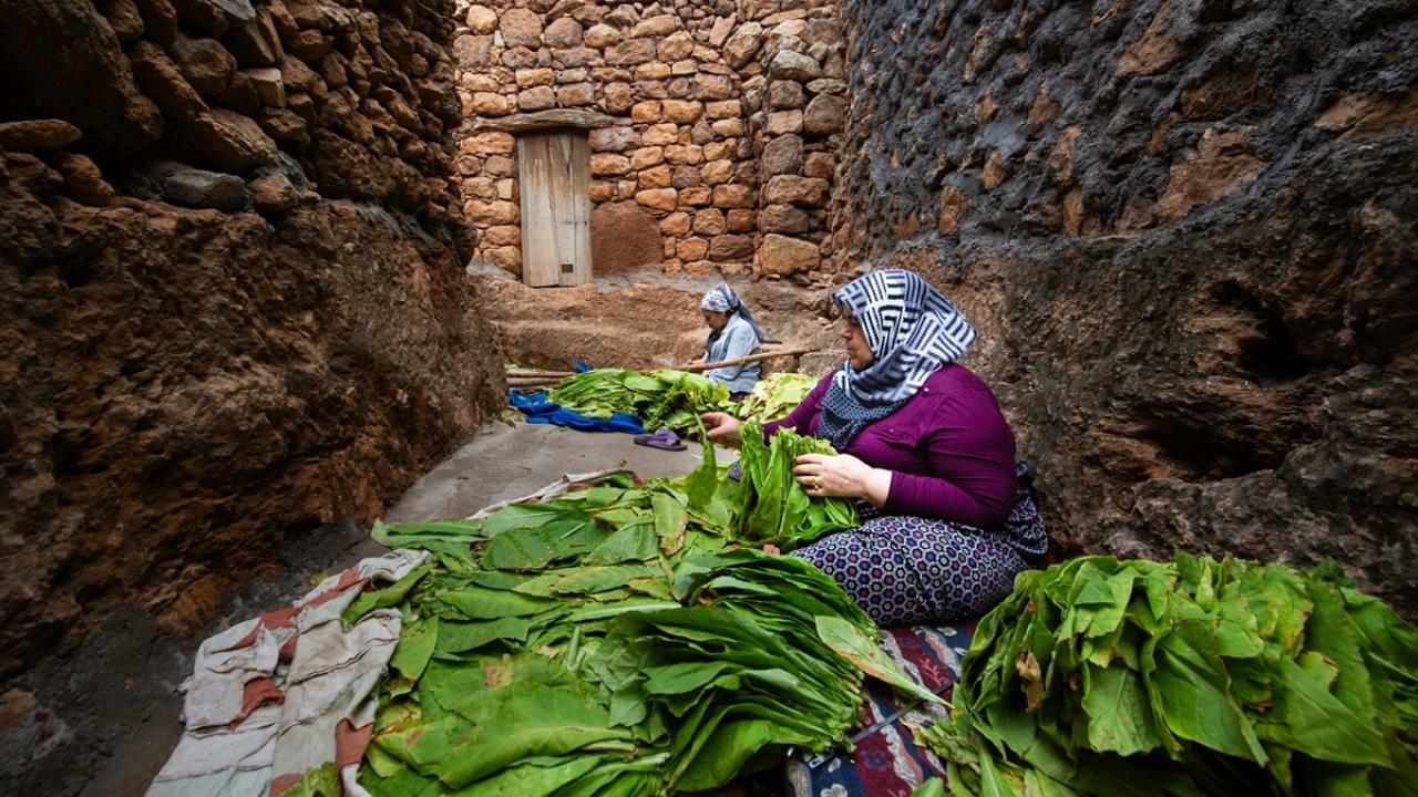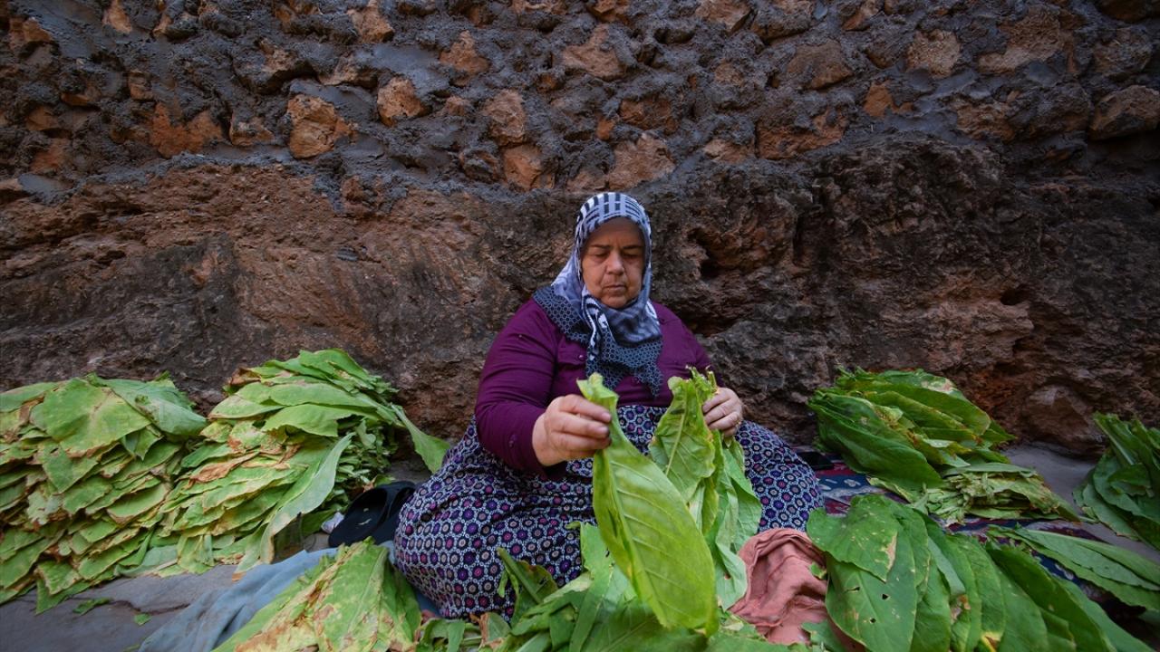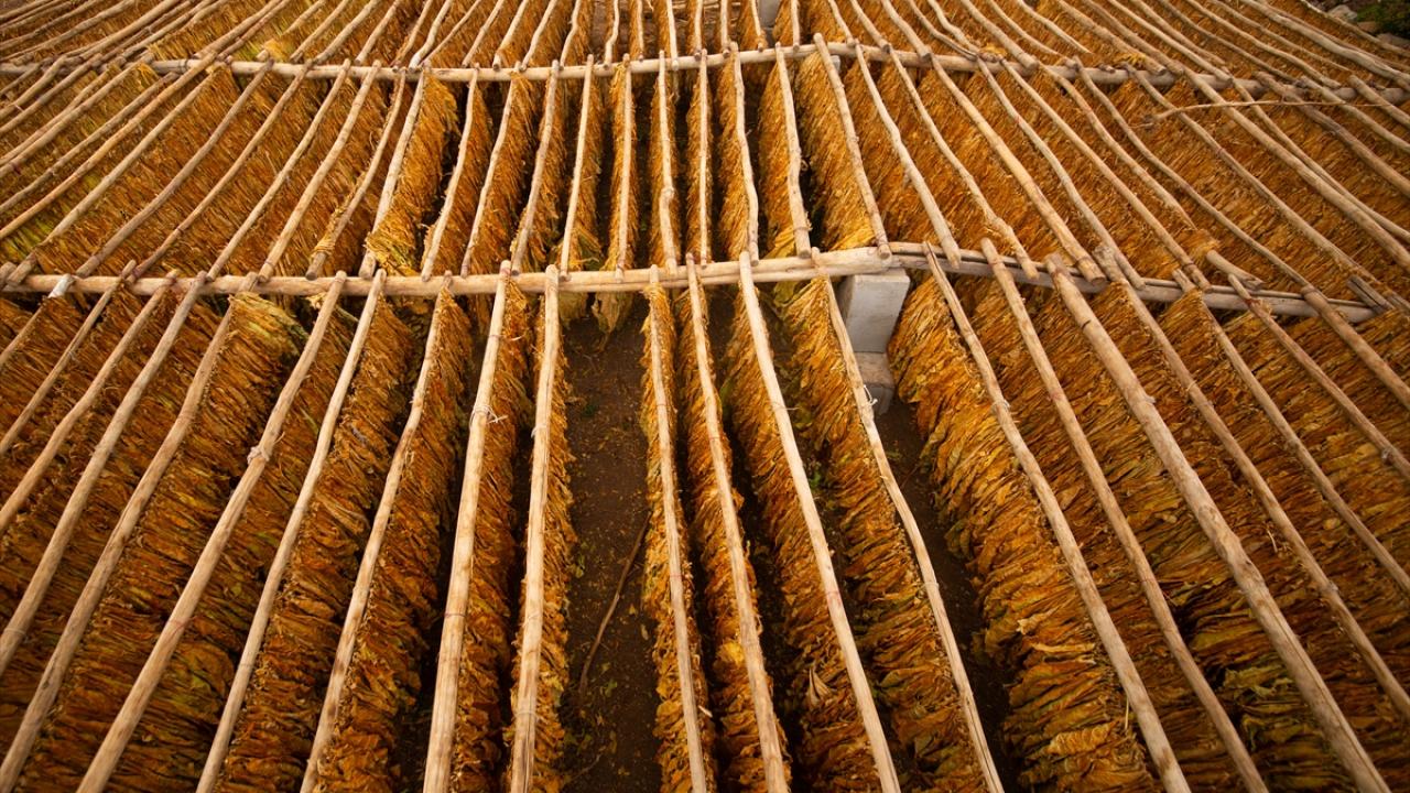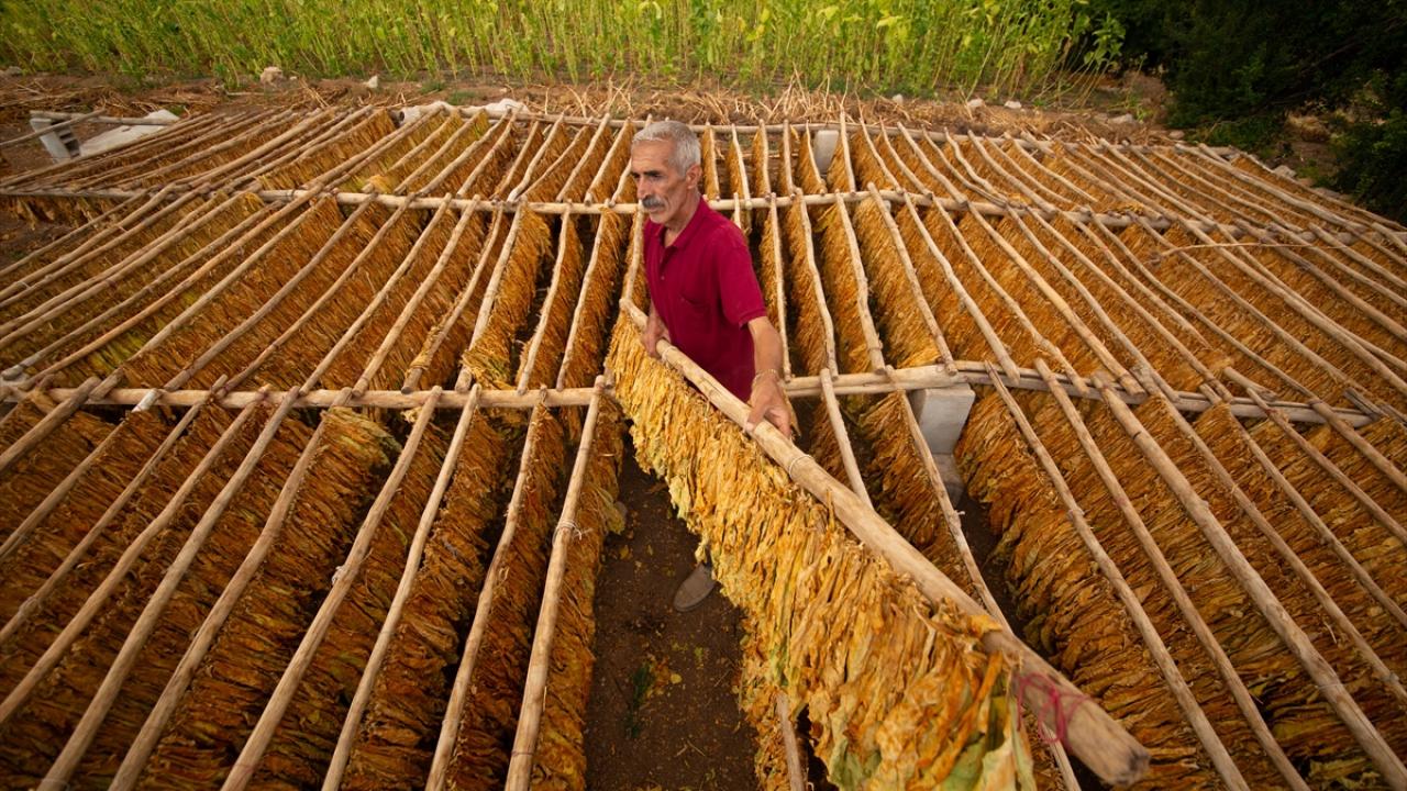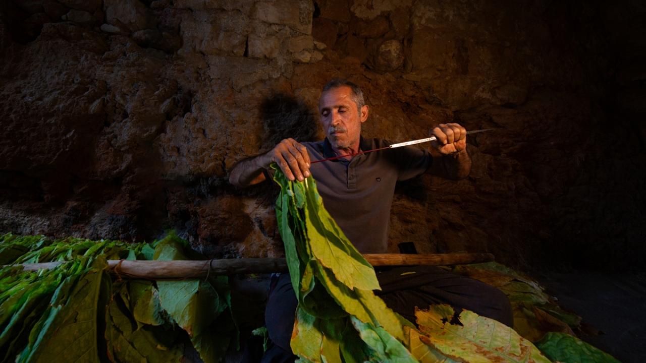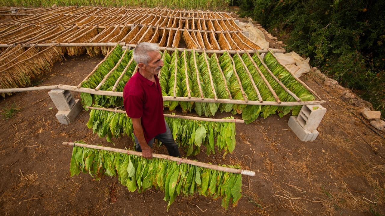 Günün ilk ışıkları ile topladıkları yeşil tütün yapraklarını iğne ya da çuvaldız yardımıyla tek tek iplere dizen çiftçiler, ardından güneş altında sararmaya bırakıyor.