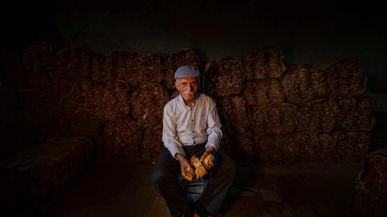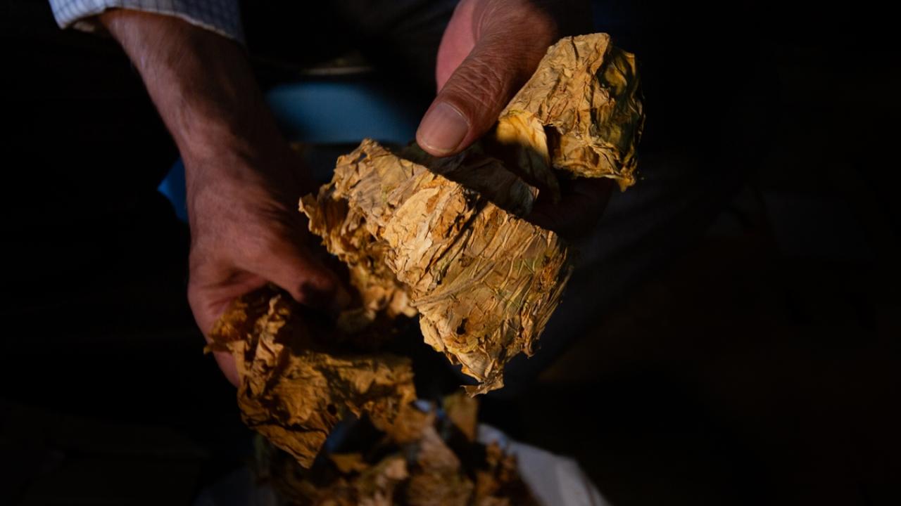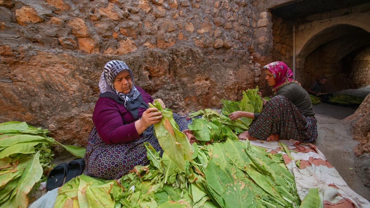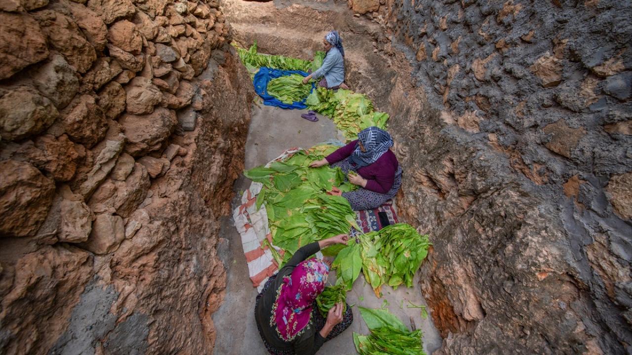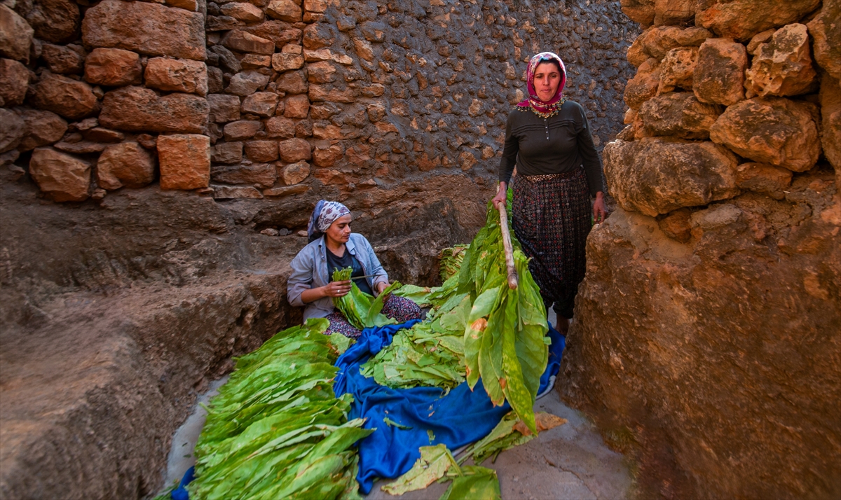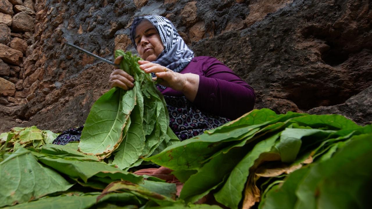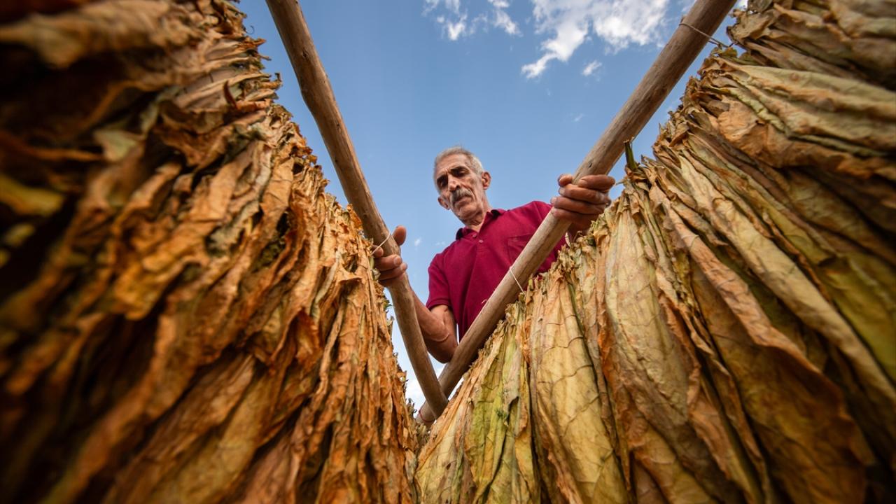 Günün ilk ışıkları ile topladıkları yeşil tütün yapraklarını iğne ya da çuvaldız yardımıyla tek tek iplere dizen çiftçiler, ardından güneş altında sararmaya bırakıyor.