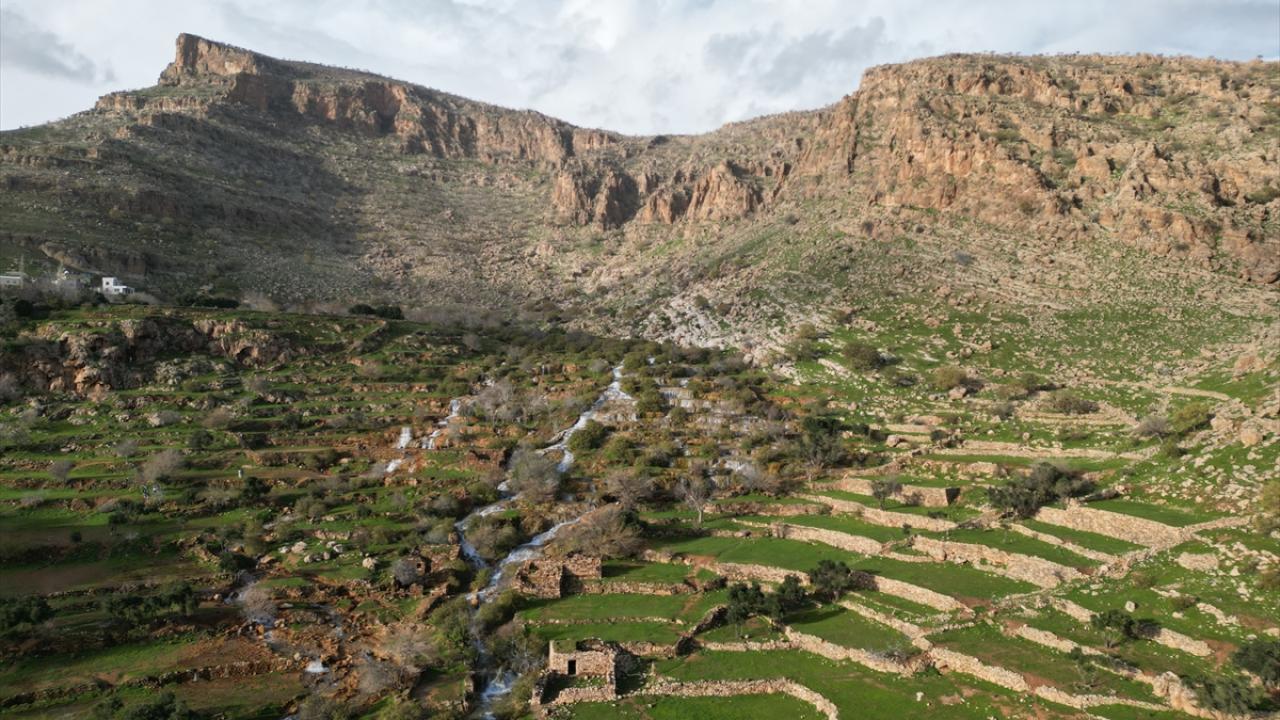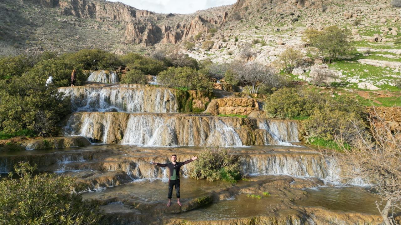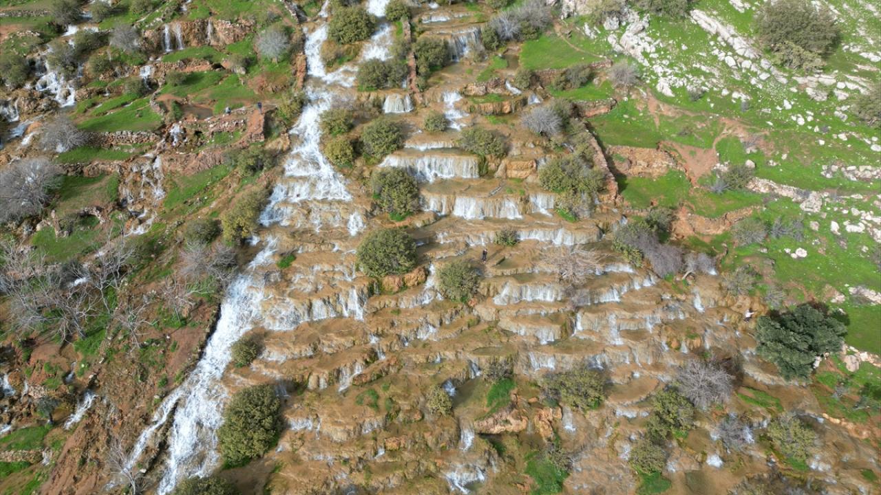 Mardin'in Kızıltepe ilçesinde "Emrud travertenleri" olarak bilinen su kaynağının oluşturduğu çağlayanlar ve şelaleler dronla görüntülendi.