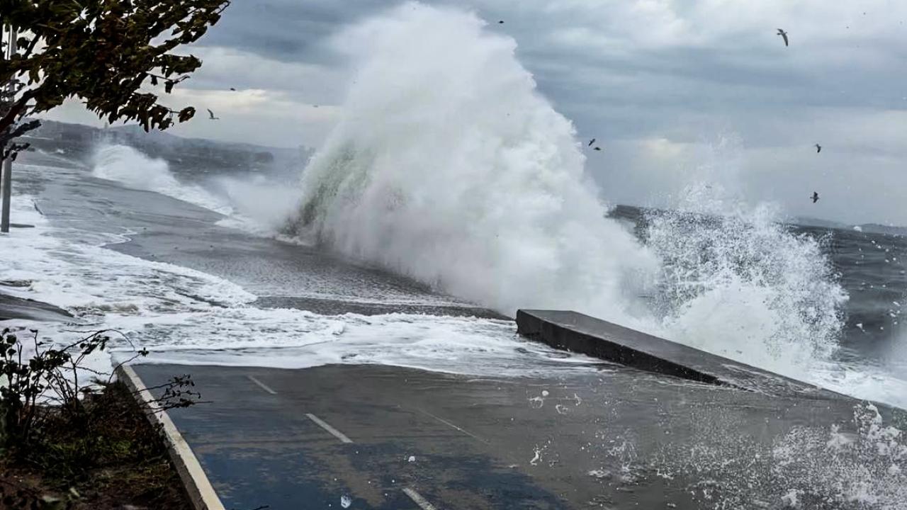 Avcılar`da, şiddetli lodosun etkisiyle dalgalar sahildeki mendireği aştı.