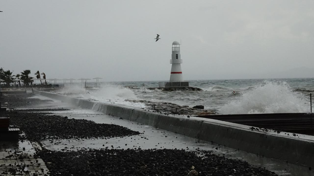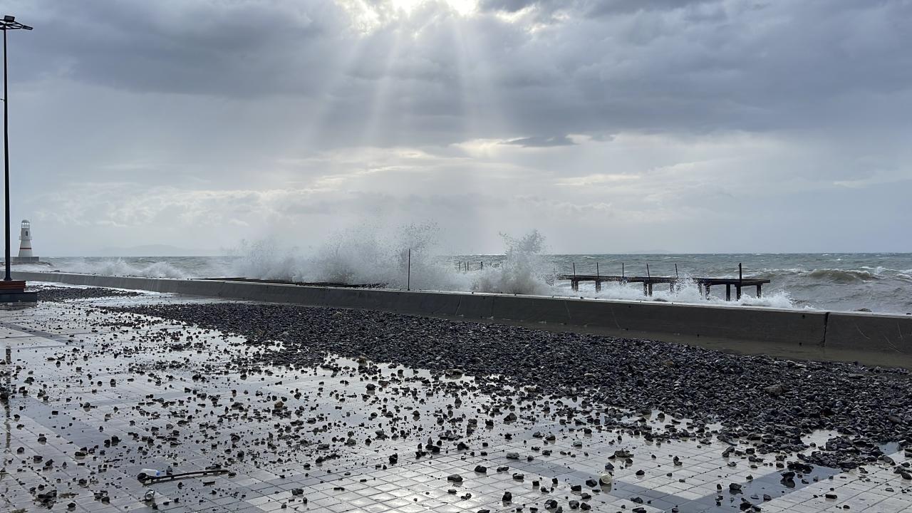 Şiddetli lodosun etkisiyle oluşan yaklaşık 3 metre boyundaki dalgalar nedeniyle kordon bölgesi deniz dolgusunda kullanılan irili ufaklı taşlarla doldu.