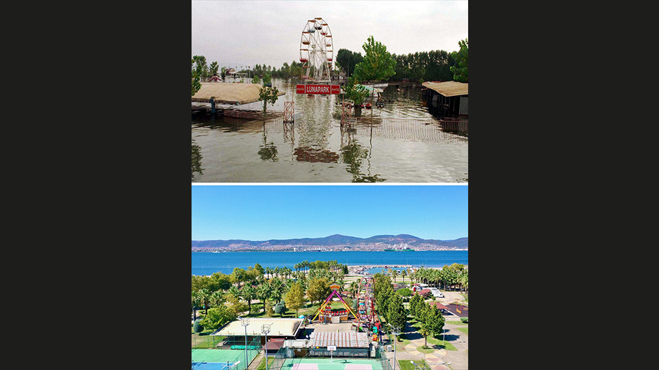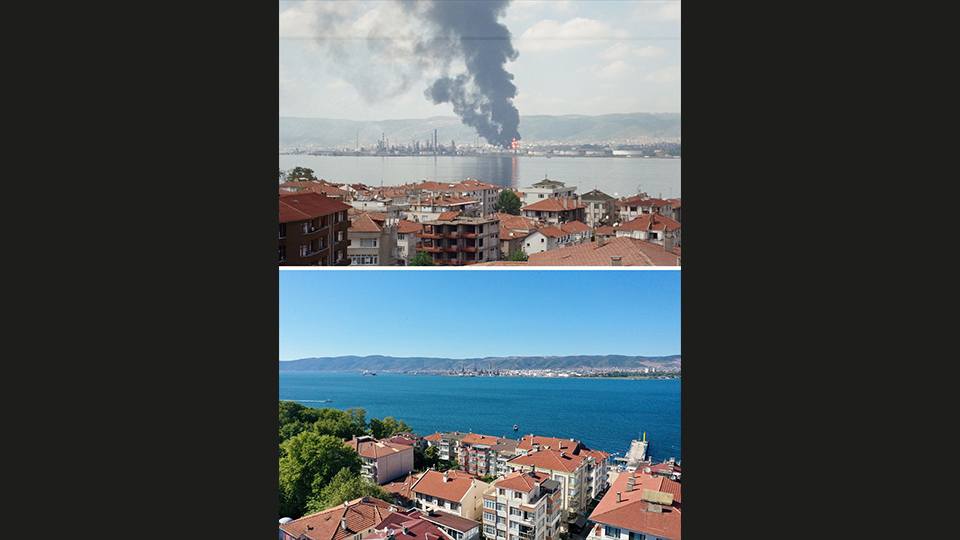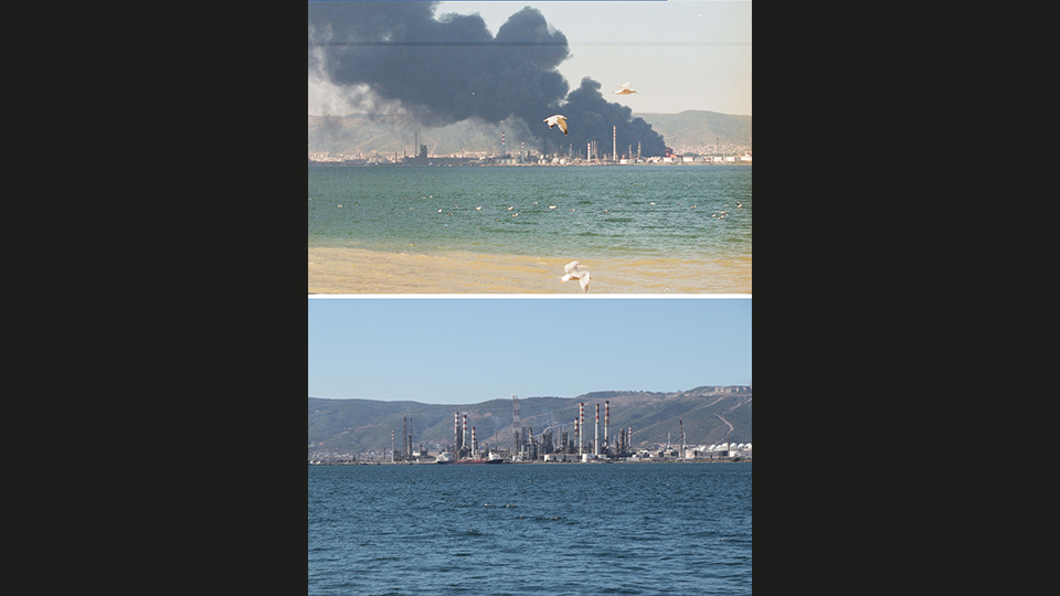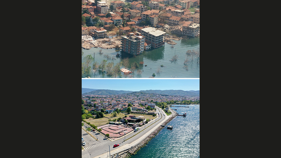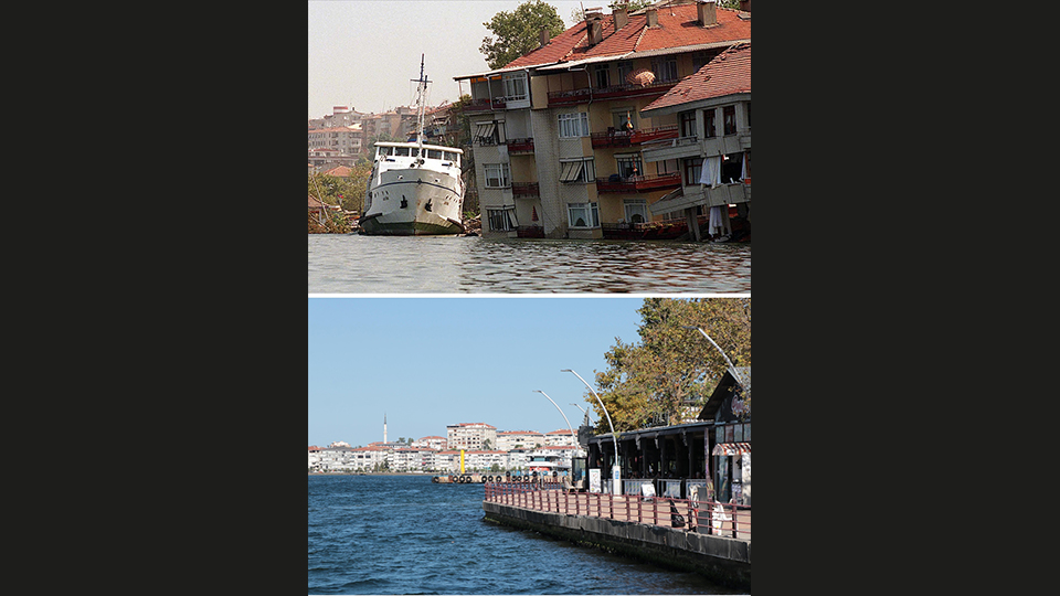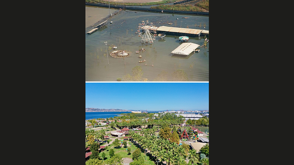 AA muhabiri, ilçede depremde hasar gören Kavaklı ve Değirmendere sahilleri ile Dumlupınar Mahallesi ve o dönemki lunaparkın bulunduğu alanların 25 yıl sonraki hallerini dronla görüntüledi. Söz konusu alanların eski ve yeni fotoğrafları, aynı karede birleştirildi.
