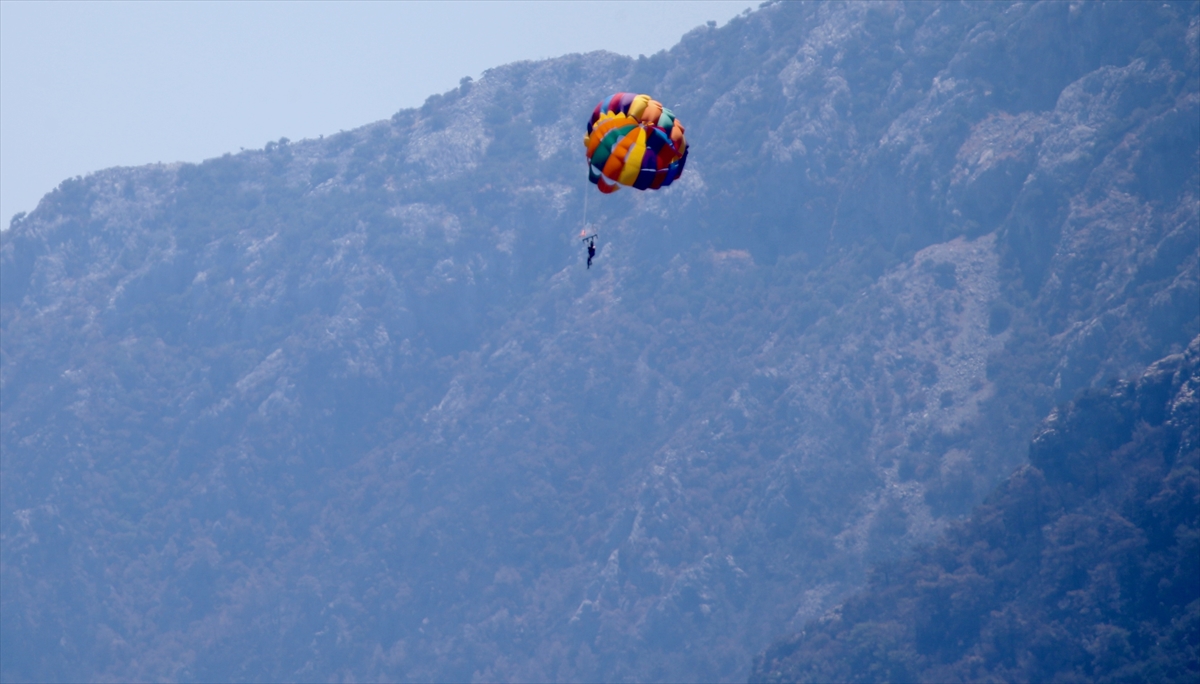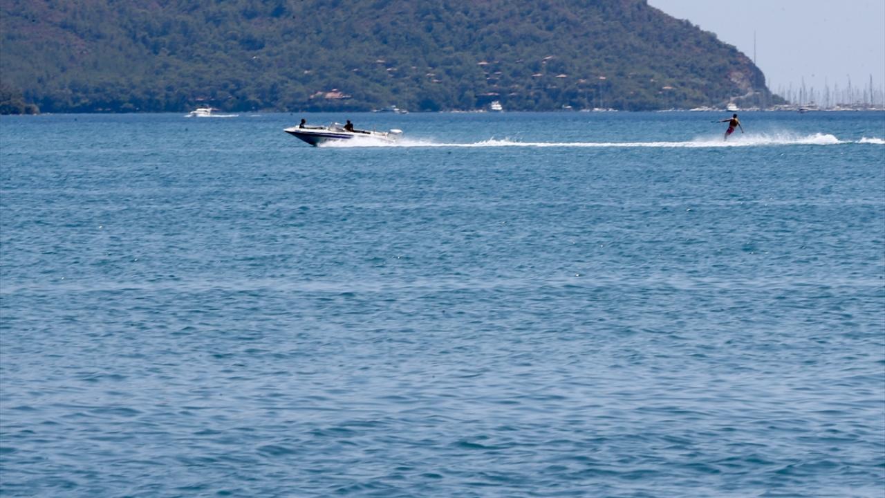 Marmaris`i çevreleyen körfezde adrenalin tutkunları ve su sporları istasyonlarında jet ski, flyboard ve deniz paraşütüne binmeyi tercih etti.