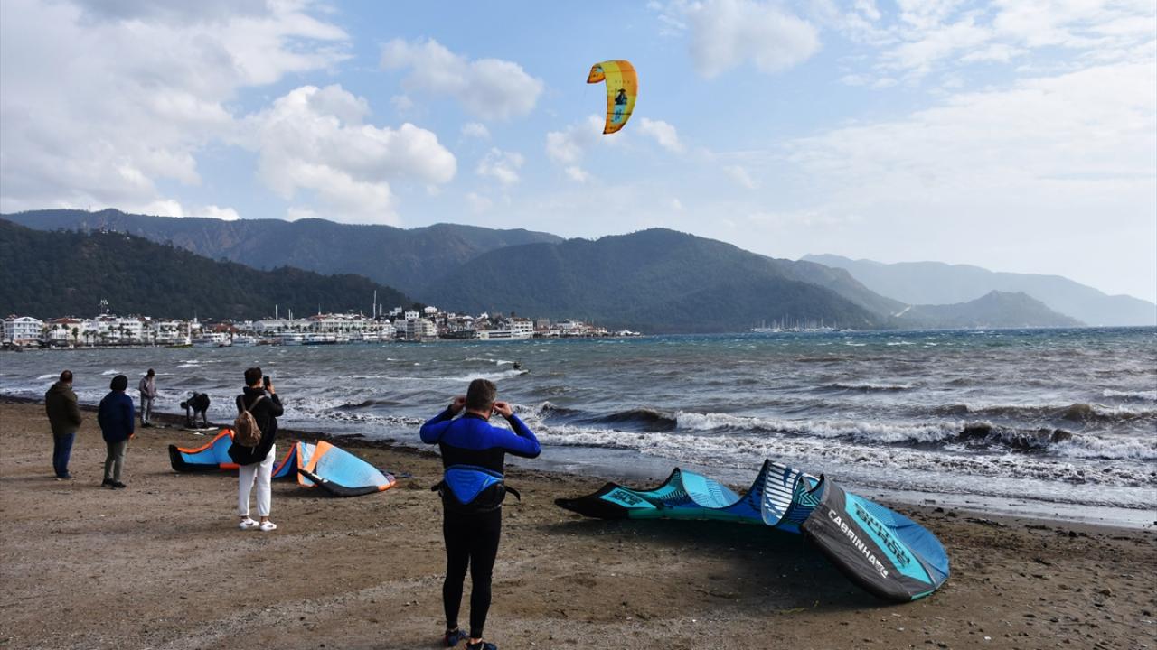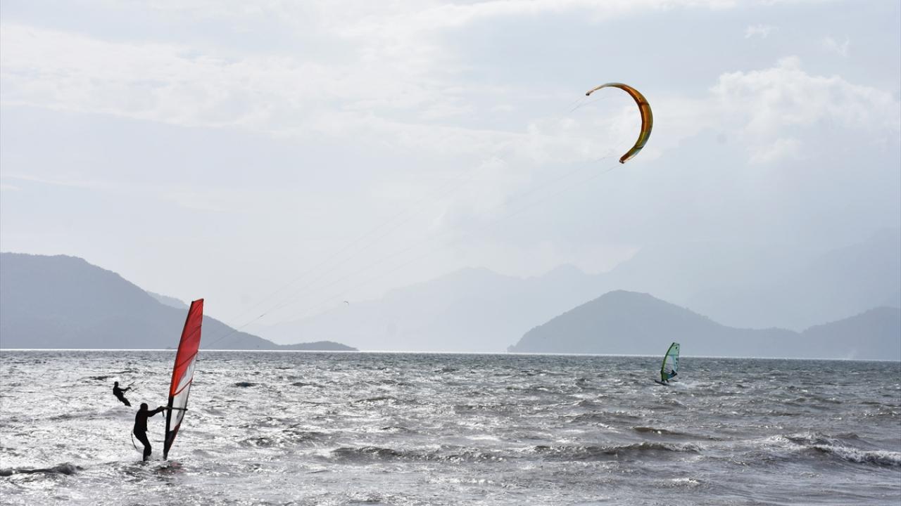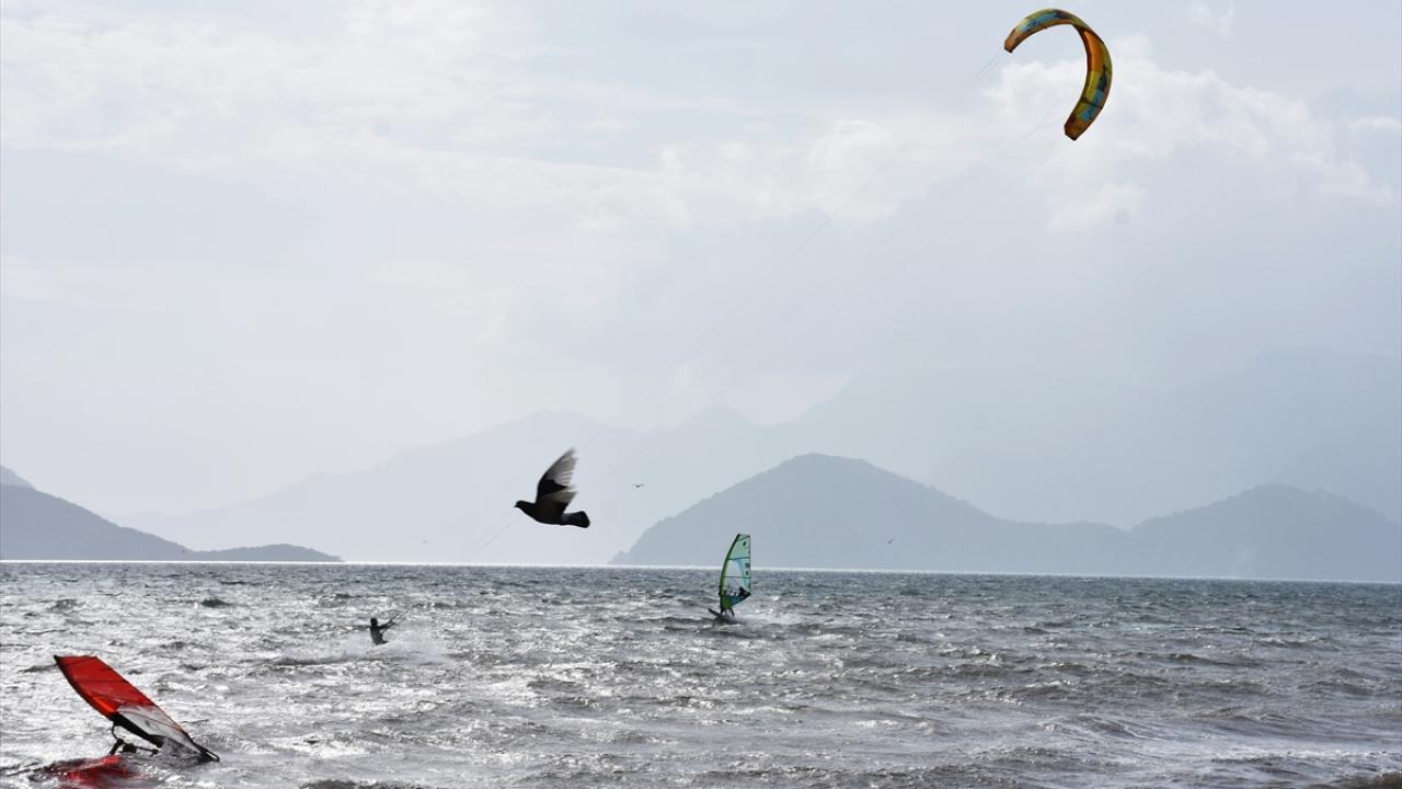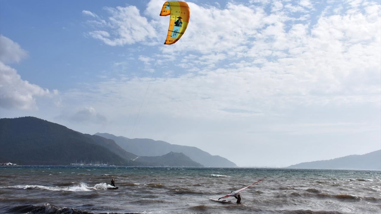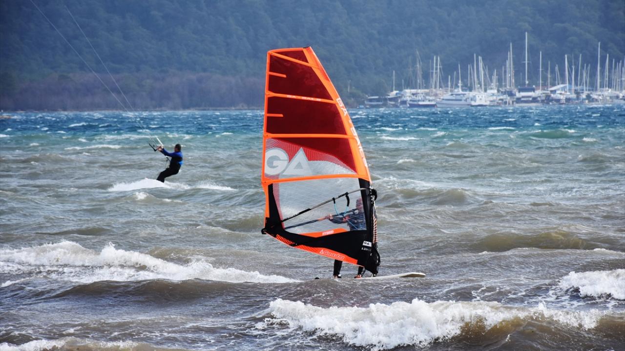Muğla'nın Marmaris ilçesinde saatte 63 kilometre hızla güneyden esen kıbleyi fırsata çeviren adrenalin tutkunları, denizde rüzgar ve uçurtma sörfü yaptı.